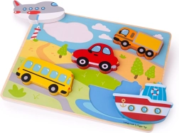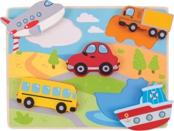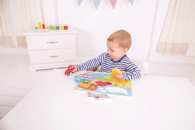 Zabavna drvena slagalica s umetanjima s prometnim sredstvima za najmlađe. Sadrži 5 velikih dijelova s ručkicom koje djeca lako umeću u odgovarajuće otvore. Podupire finu motoriku, koordinacijske vještine, učenje oblika i boja te razvoj rječnika. Izrađeno od kvalitetnog drva i udovoljava europskim sigurnosnim normama.