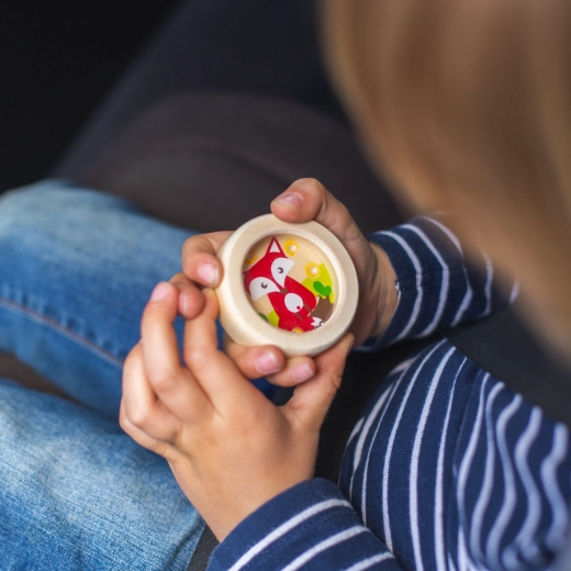 Zahvaljujući čvrstom drvenom tijelu i prozirnom pokrovu, igračka je izdržljiva i sigurna. Savršeno leži u dječjoj ruci i lako stane u ruksak – super za putovanja, čekaonicu i za doma.