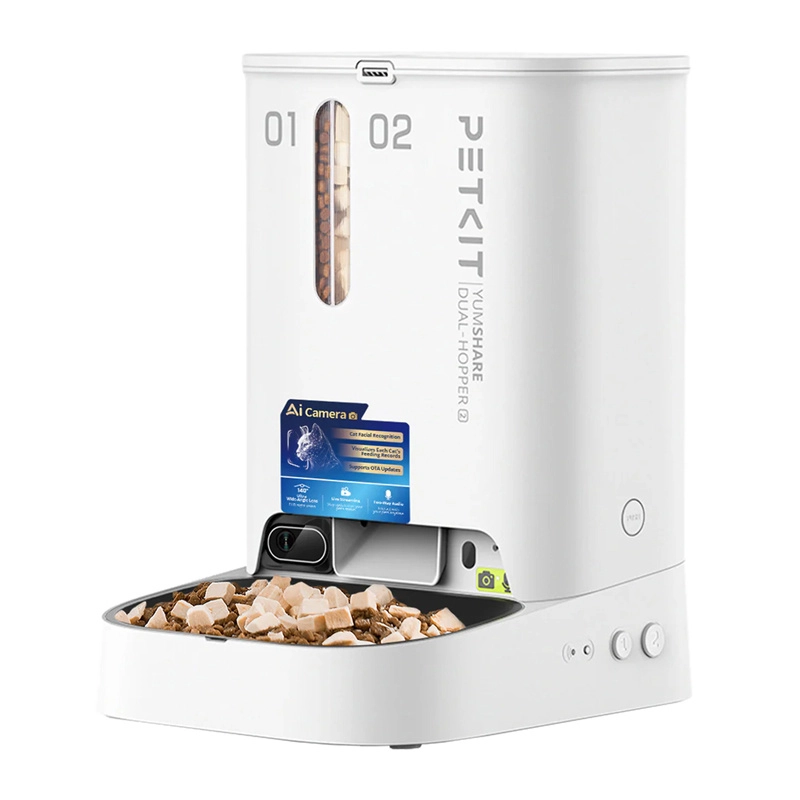 Pametni dozator PETKIT YumShare Dual Hopper 2 s ugrađenom kamerom i umjetnom inteligencijom osigurava precizne porcije, prepoznavanje pojedinih ljubimaca i udaljeni nadzor. Uživajte u neprekidnom prijenosu uživo, analizi hranjenja, dvostrukom spremniku za miješanje hrane i glatkom radu bez zaglavljivanja – sve upravljano putem aplikacije.