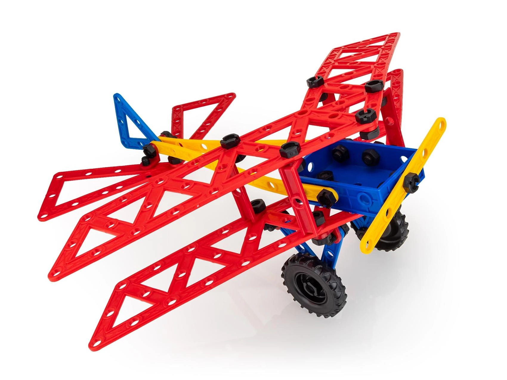 Veliki perforirani paneli, nosači i spojnice omogućuju sastavljanje niza modela od aviona do broda – mašti nema granica.