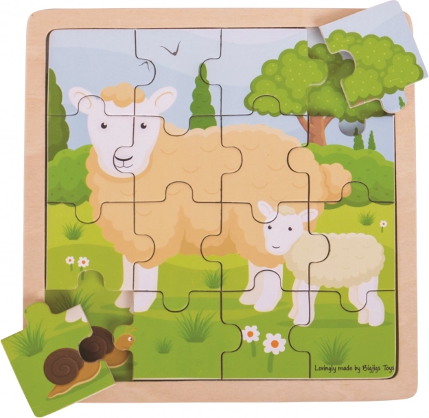 Ove drvene puzzle u okviru BIGJIGS TOYS donose nježan motiv ovčice s janjetom koji će oduševiti djecu na prvi pogled. Dijelovi se slažu izravno u okvir na podlogu s istim motivom, pa se slika ne pomiče i djeca lako vide gdje koji dio pripada.