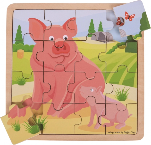 Preslatke drvene puzzle s motivom praščića i prasića idealna su prva slagalica za djecu od 2 godine. Sadrži 16 čvrstih dijelova koji se slažu u okvir s istom podlogom radi lakšeg snalaženja. Veliki dijelovi dobro leže u dječjoj ruci, a slaganje potiče motoriku, koncentraciju, maštu i rječnik. Izrađeno od kvalitetnog drva iz odgovornih izvora, u skladu s europskim sigurnosnim normama.