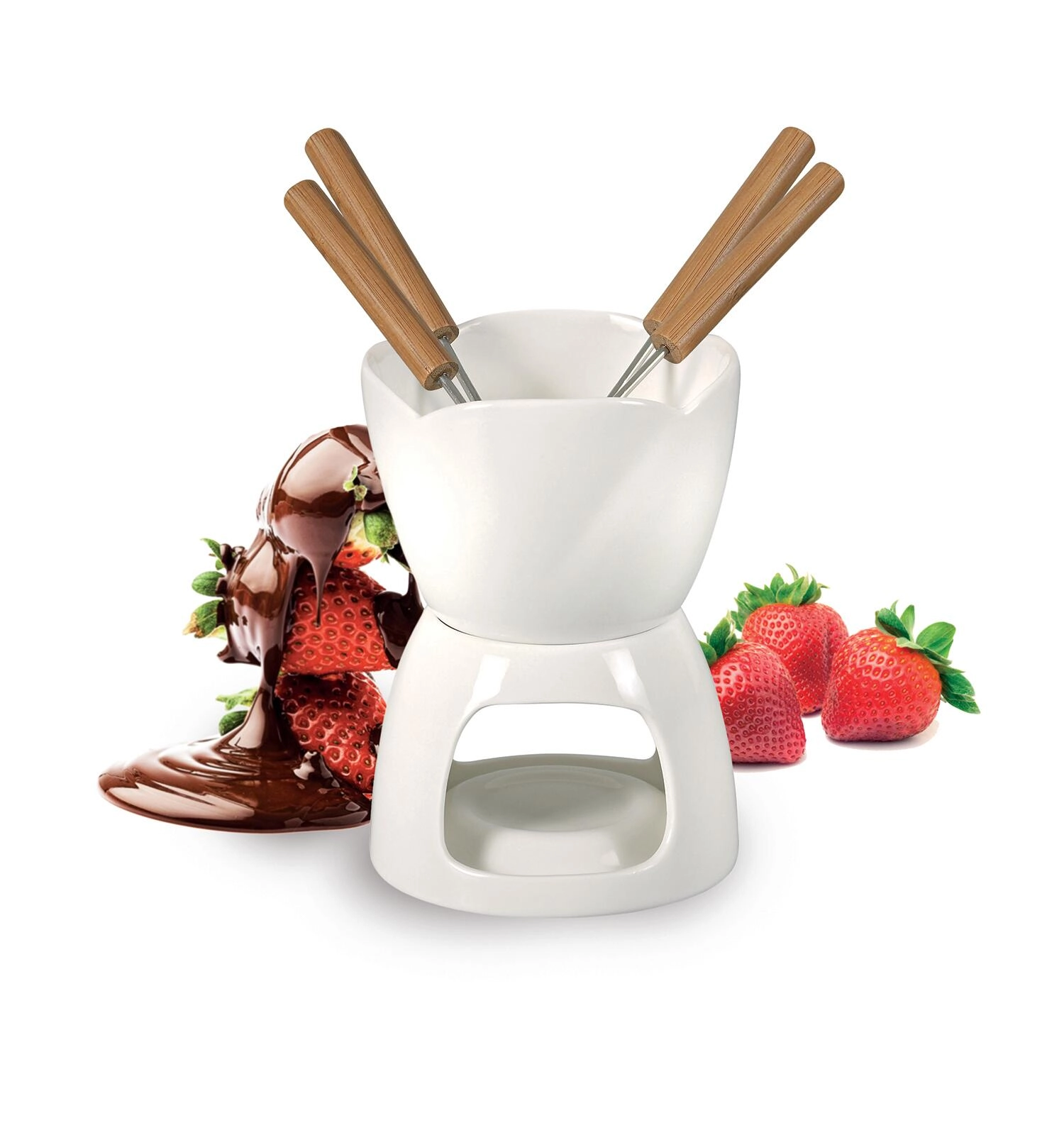 Stilizan i funkcionalan set za čokoladni fondue Collezione Bianca idealan je za romantične večeri, proslave i opuštena druženja. Bijela keramika uklapa se u svaku kuhinju i lako se čisti. Dovoljno je zapaliti lučicu, umetnuti je u stalak i uživati u savršeno otopljenoj čokoladi s voćem, keksima ili marshmallowima.