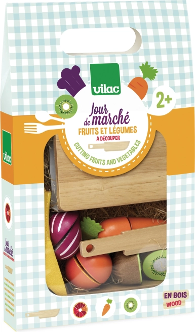 Drvena košarica s voćem i povrćem je idealna za dječje kuhinje. Sadrži pet vrsta voća i povrća, dasku za rezanje i nož, sve izrađeno od kvalitetnog drva.