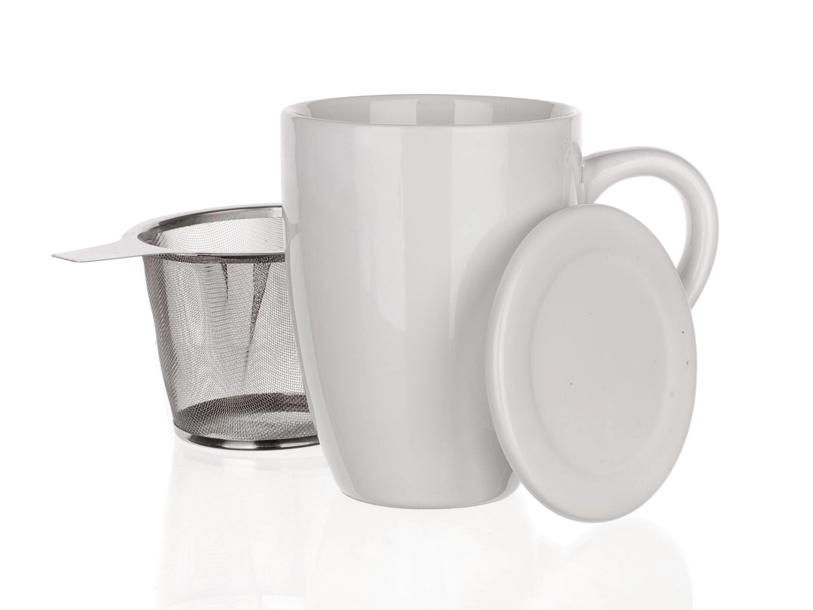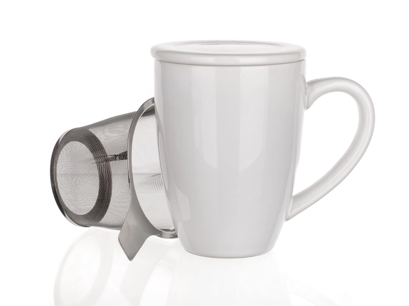 Praktična i elegantna bijela šalica zapremnine 350 ml s poklopcem i nehrđajućim cjedilom za udobno namakanje rinčanog čaja izravno u šalici. Zahvaljujući poklopcu za zadržavanje topline i finom cjedilu uživat ćete u punom okusu napitka bez listića i sitnih čestica. Idealno za svakodnevnu uporabu kod kuće i u uredu.