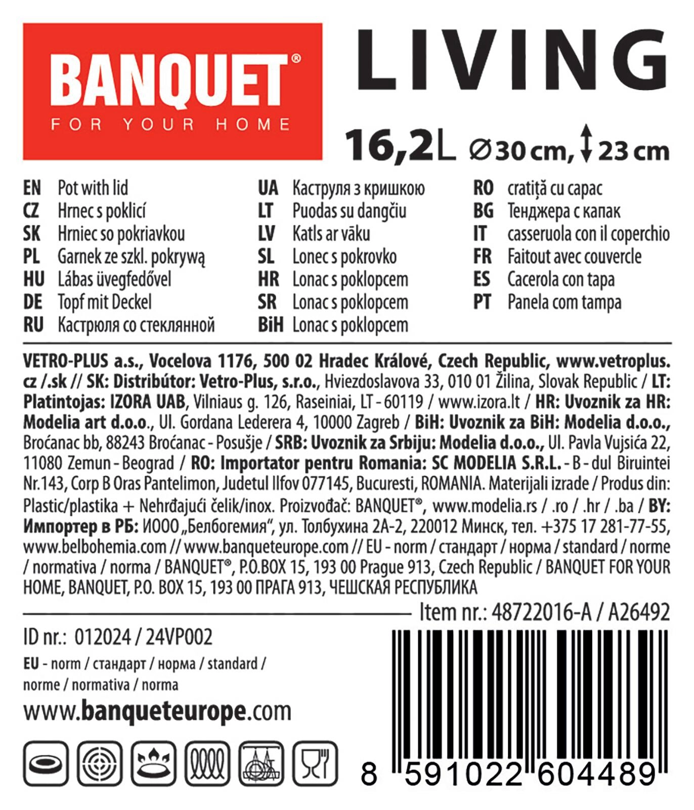 Velikokapacitetni nehrđajući lonac LIVING zapremine 16,2 l i promjera 30 cm idealan je za kuhanje juha, temeljaca i tjestenine. Ima kvalitetnu izvedbu od nehrđajućeg čelika, stakleni poklopac s nehrđajućim gumbom i čvrste ručke. Elegantnu sjajnu površinu upotpunjuju tri mat pruge, a lonac je pogodan za sve vrste ploča za kuhanje, uključujući indukciju.