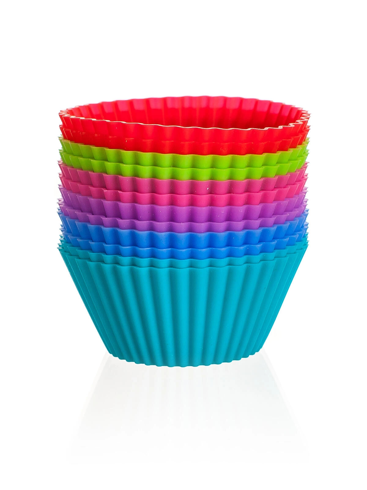 Praktičan set od 12 silikonskih košarica za pečenje promjera 6 cm i visine 2,7 cm u raznobojnoj mješavini. Lako vađenje, višekratna upotreba, otpornost do 230 °C i mogućnost pranja u perilici posuđa čine ove kalupiće idealnim izborom za kućno pečenje muffina i cupcakesa.