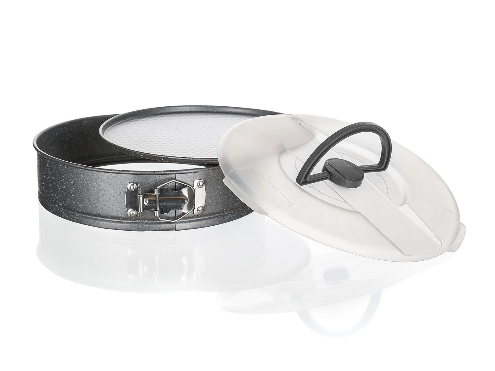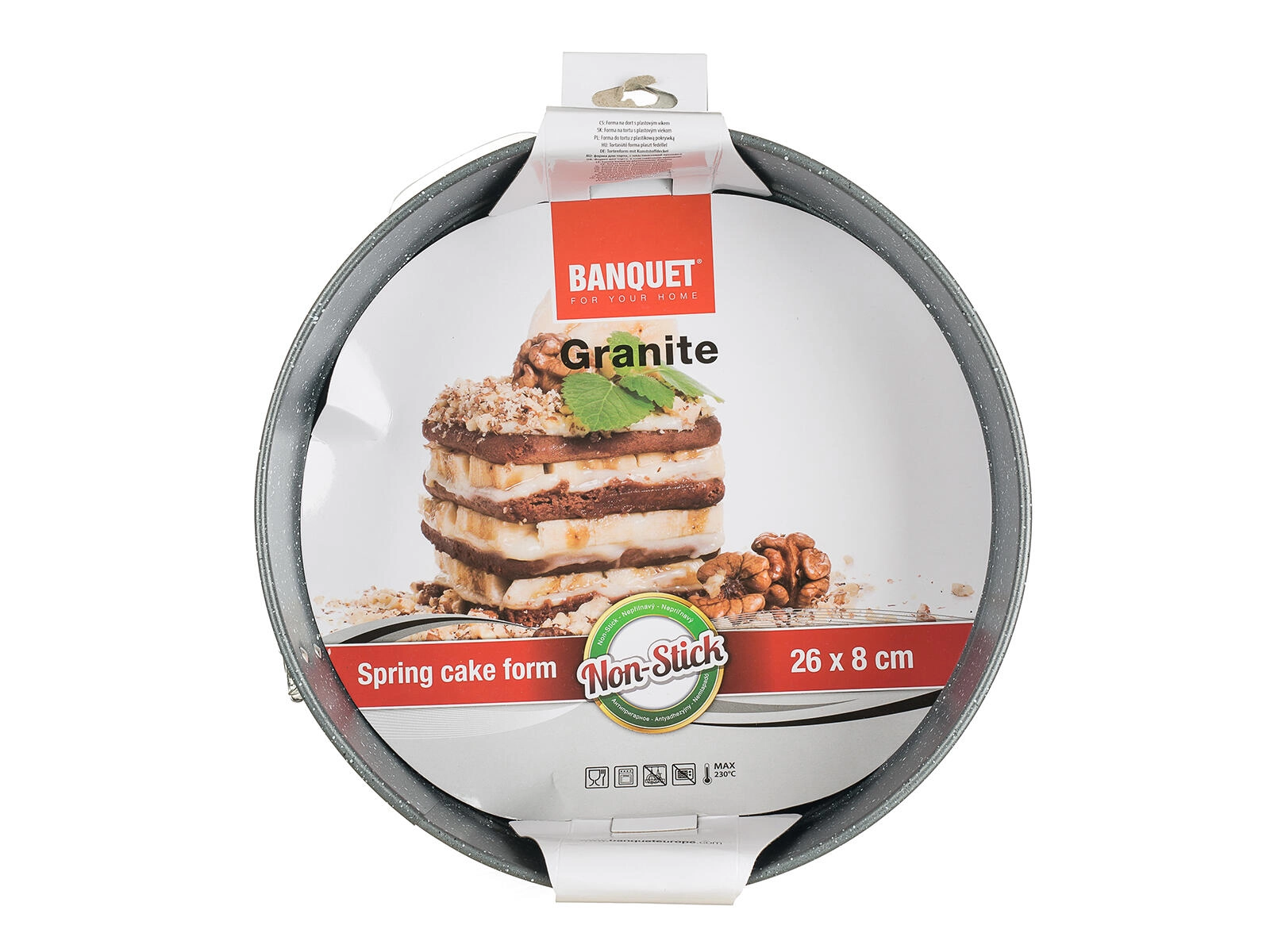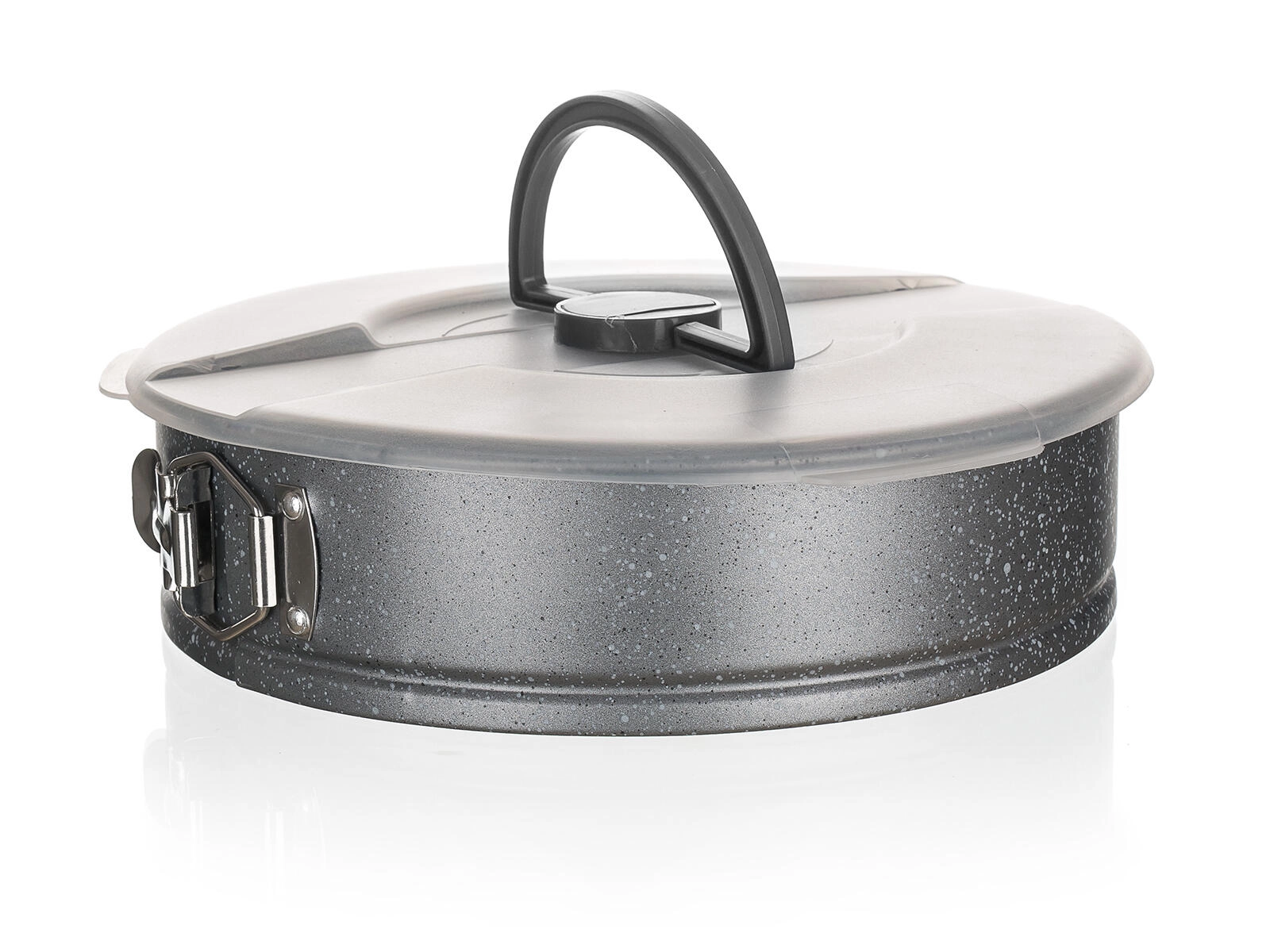 Praktičan okrugli kalup za tortu promjera 26 cm s neprianjajućom površinom GRANITE i odvojivim rubom za lako vađenje biskvita. Dio kompleta je i plastični poklopac s ručkom za sigurno prenošenje i čuvanje. Izdržljiv karbonski čelik s površinom Xynflon osigurava ravnomjerno pečenje i jednostavno čišćenje.