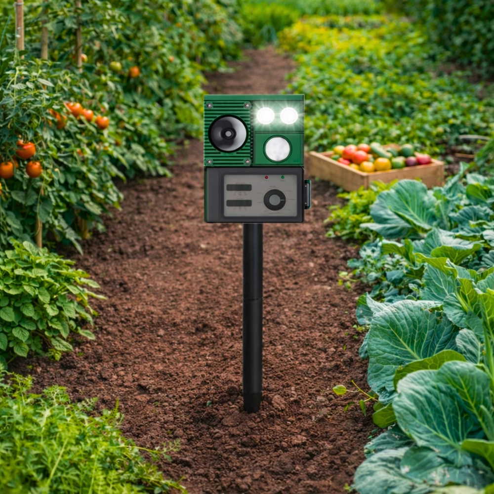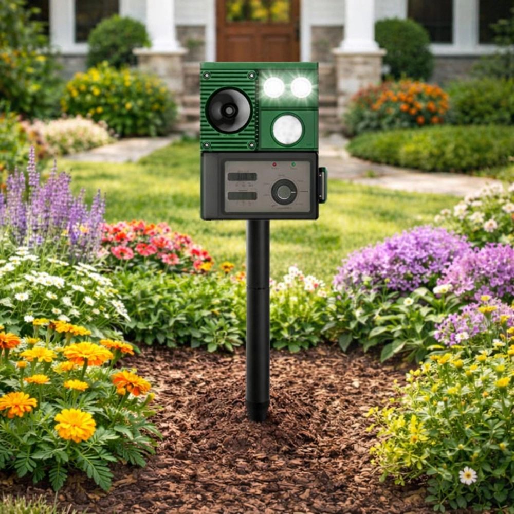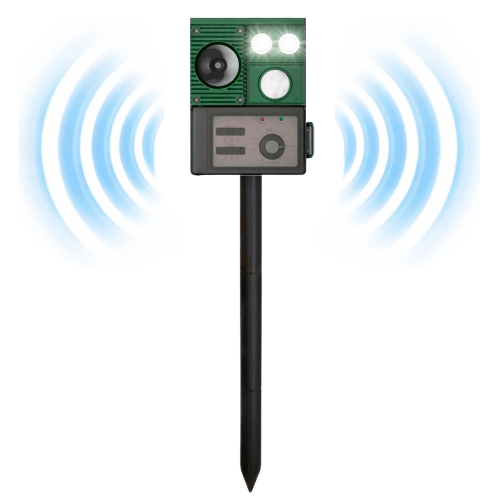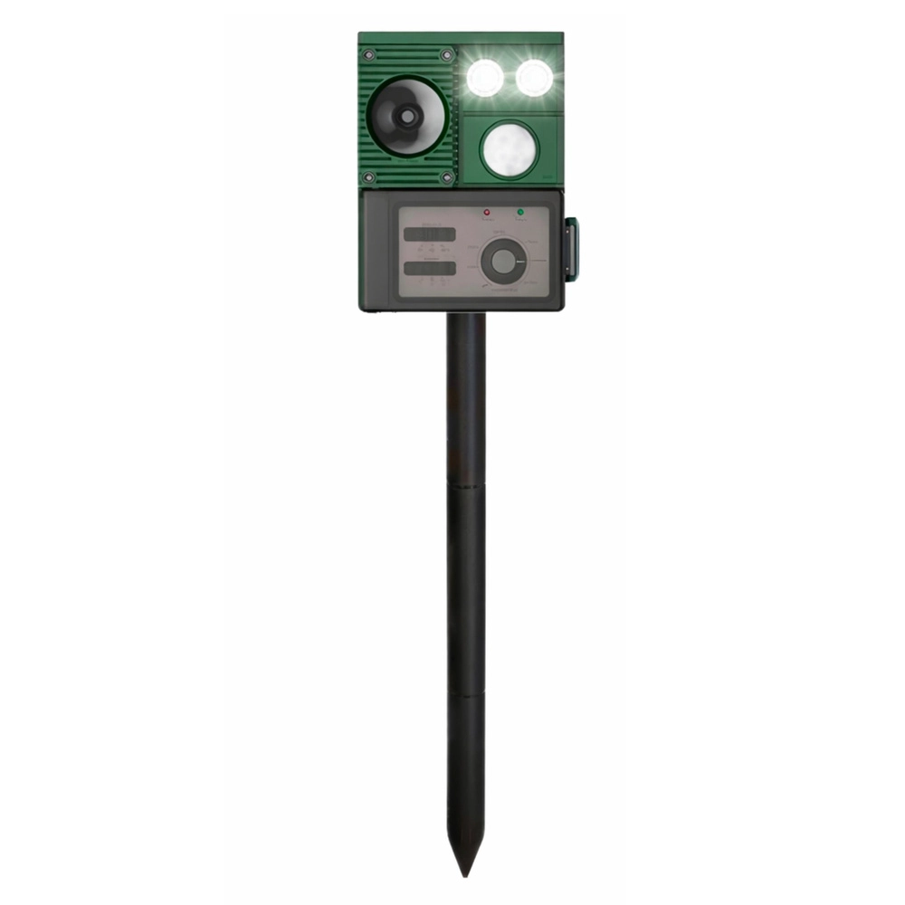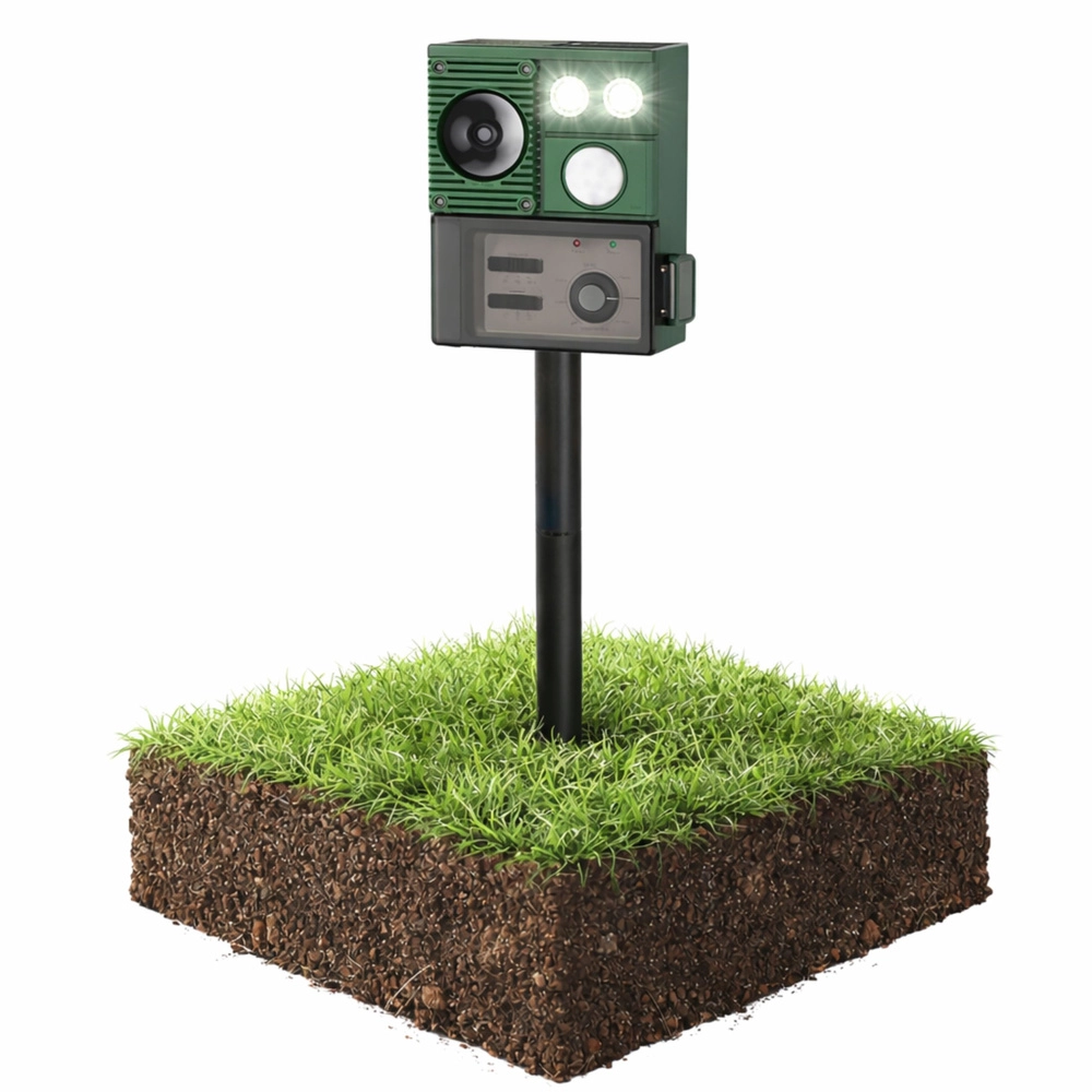 Moderni solarni rastjerivač životinja praktično je rješenje za zaštitu travnjaka, gredica i uroda od neželjenih posjetitelja. Uređaj koristi kombinaciju ultrazvuka, zvučnih signala i PIR senzora, koji pokreće rastjerivanje samo pri detekciji pokreta. LED svjetla pojačavaju učinak osobito nakon sumraka.