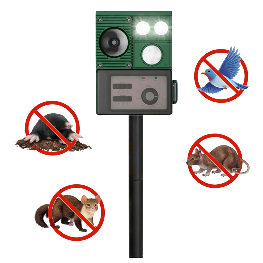 Ugrađeni solarni panel kontinuirano puni bateriju tijekom dana, pa je rad praktičan i bez potrebe za zamjenom baterija. Zahvaljujući podešavanju osjetljivosti i frekvencije ultrazvuka lako prilagođavate učinak različitim vrstama životinja i uvjetima okoline. Izdržljivo kućište i zemni šiljak omogućuju brzo postavljanje u tlo.