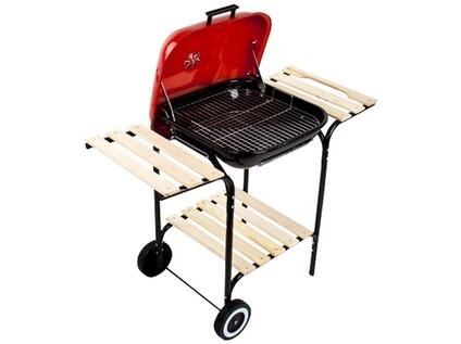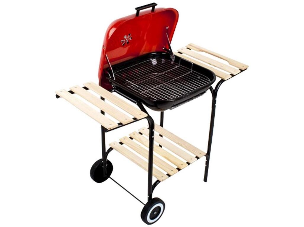 Ložište s emajliranom površinom otporno je na visoke temperature i jednostavno za čišćenje, dok poklopac u crvenoj praškastoj boji daje roštilju stilski izgled i štiti od vremenskih utjecaja. Drvene odlagalne police pružaju dovoljno prostora za pribor i namirnice, a zahvaljujući kotačima roštilj lako premjestite tamo gdje vam je potreban.