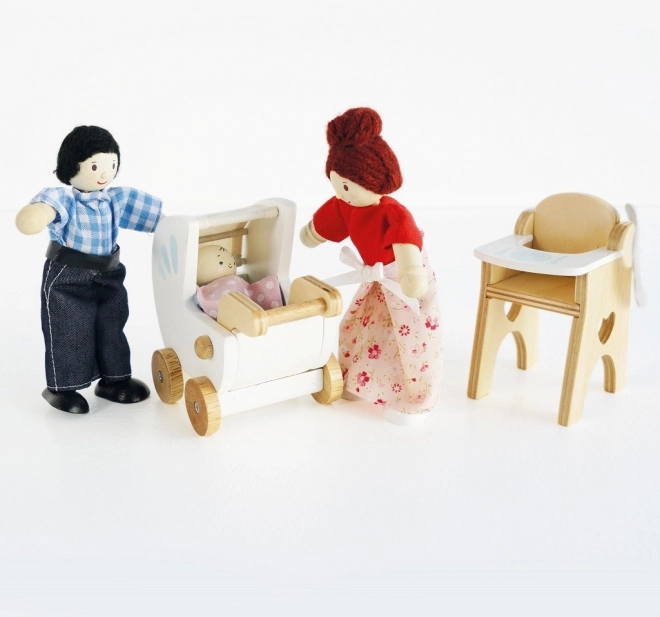 Presladak drveni set za maštovitu igru s bebom brenda LE TOY VAN. Sadrži kolica, visoku hranilicu, set za hranjenje i torbu. Tekstilni dodaci su ručno šivani, a svi dijelovi izrađeni su od kvalitetnog kaučukovog drva. Igračka je ukrašena netoksičnim bojama na bazi vode, etički je proizvedena i poticanje kreativnosti, fine motorike i koordinacije.