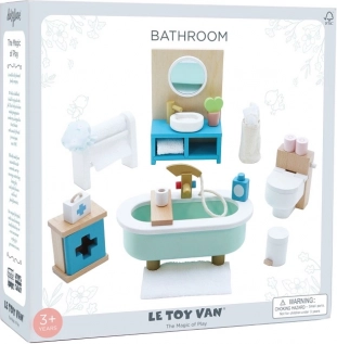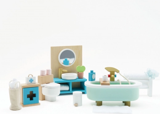 Drveni kupaonski set LE TOY VAN Daisylane za kućicu 1:12. 19 dijelova, etička proizvodnja, netoksične boje, potiče kreativnu i maštovitu igru. 3+.