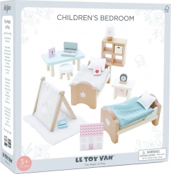 Ovaj elegantni set od 24 dijela za dječju sobu za lutke sadrži krevete s jastucima i pokrivačima, noćni ormarić s lampom, stolicu, tepih i ukrase, koji daju realističan izgled. Drveni detalji i nježne pastelne boje donose dojam stila i elegancije. Izrađeno etički od održivih materijala i oslikano netoksičnim bojama na bazi vode.