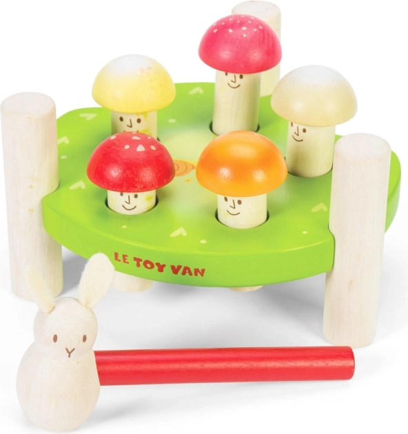 Igračka razvija motoričke vještine time što djeca koriste čekić za zabijanje muharica. Šareni dizajni i oblici potiču vizualnu percepciju.
