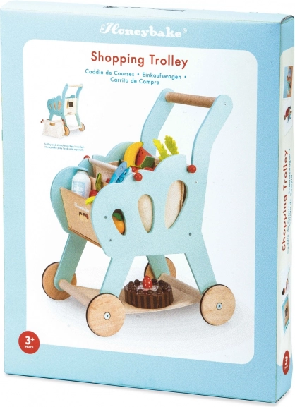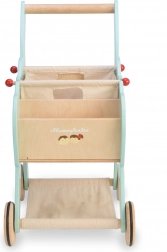 Kolica imaju promišljenu podjelu – dvije gornje pregrade, prostrano dno za veće kupovine, tekstilnu torbu za pakiranje namirnica te praktičnu pločicu za pisanje kredom. Igra potiče igru uloga, razvoj komunikacije, koordinacije oko–ruka i kognitivnih vještina. Pažljiva izrada s naglaskom na etiku i održivost razveselit će djecu i roditelje.