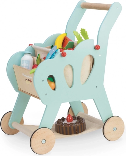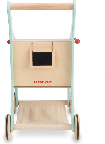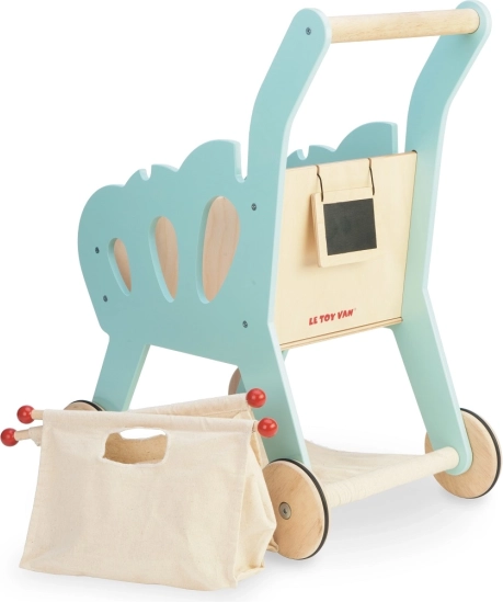 Stilska drvena kupovna kolica LE TOY VAN u pastelnoplavoj boji potiču maštovitu igru, razvijaju finu motoriku i društvene vještine. Nude dvije unutarnje pregrade, donji odlagni prostor, tekstilnu torbu i malu pločicu za popis za kupnju. Izrađena od FSC certificiranog drva, sigurno zaobljena, ručno dorađena netoksičnim bojama na bazi vode.