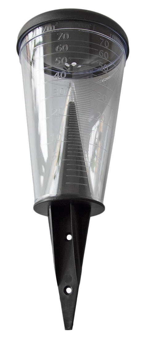 Poklopac u obliku lijevka štiti od isparavanja te učinkovito prikuplja kišne kapljice. Praktični držač možete jednostavno zabiti u zemlju ili pričvrstiti na štap (štap nije uključen u pakiranje), što omogućuje fleksibilno postavljanje za što točnije mjerenje.