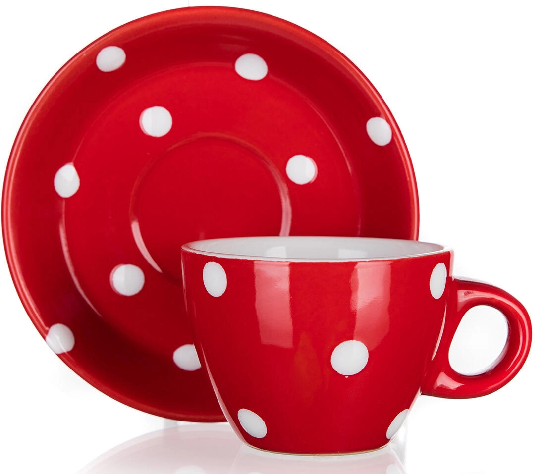 Stilna keramička šalica s tanjurićem zapremine 100 ml u crvenoj boji s bijelim točkicama oduševit će pri svakodnevnoj upotrebi. Zahvaljujući izdržljivom materijalu prikladna je za mikrovalnu pećnicu i perilicu posuđa, pa ćete svoju omiljenu kavu ili espresso uživati udobno i bez brige.