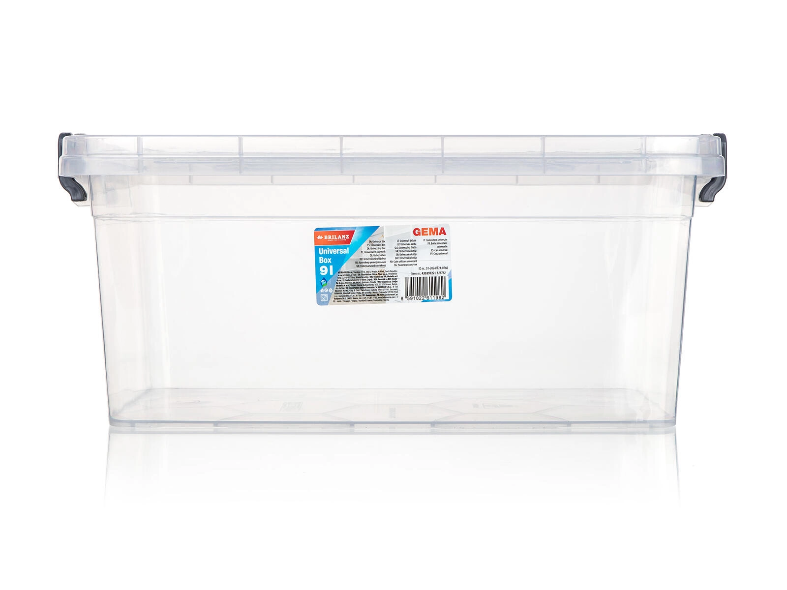 Praktični spremnik GEMA 9 l s čvrstim sivim kopčama i prozornim tijelom za brzi uvid u sadržaj. Idealan za organizaciju kućanstva, ureda i radionice, nudi sigurno zatvaranje poklopca i jednostavno rukovanje.