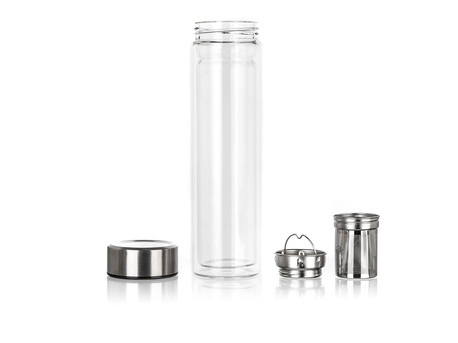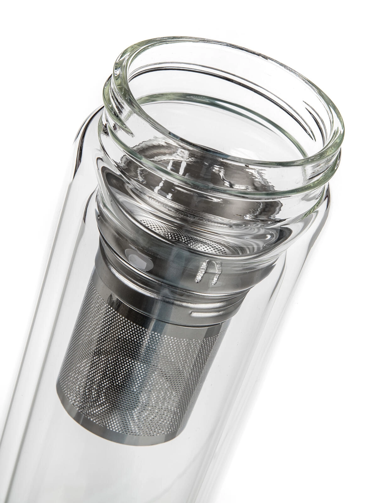 Sastavni dio je uklonjivo fino cjedilo od nehrđajućeg čelika koje omogućuje praktično namakanje rasutog čaja ili pripremu infuzija s biljem i voćem izravno u boci. Poklopac od nehrđajućeg čelika 18/8 jamči higijenu, trajnost i sigurno zatvaranje. Čist, moderan dizajn od prozirnog stakla dodatno ističe boju napitka.