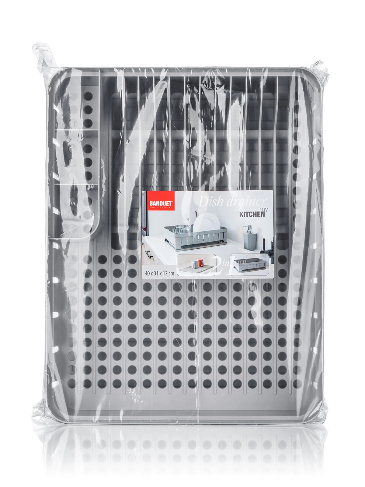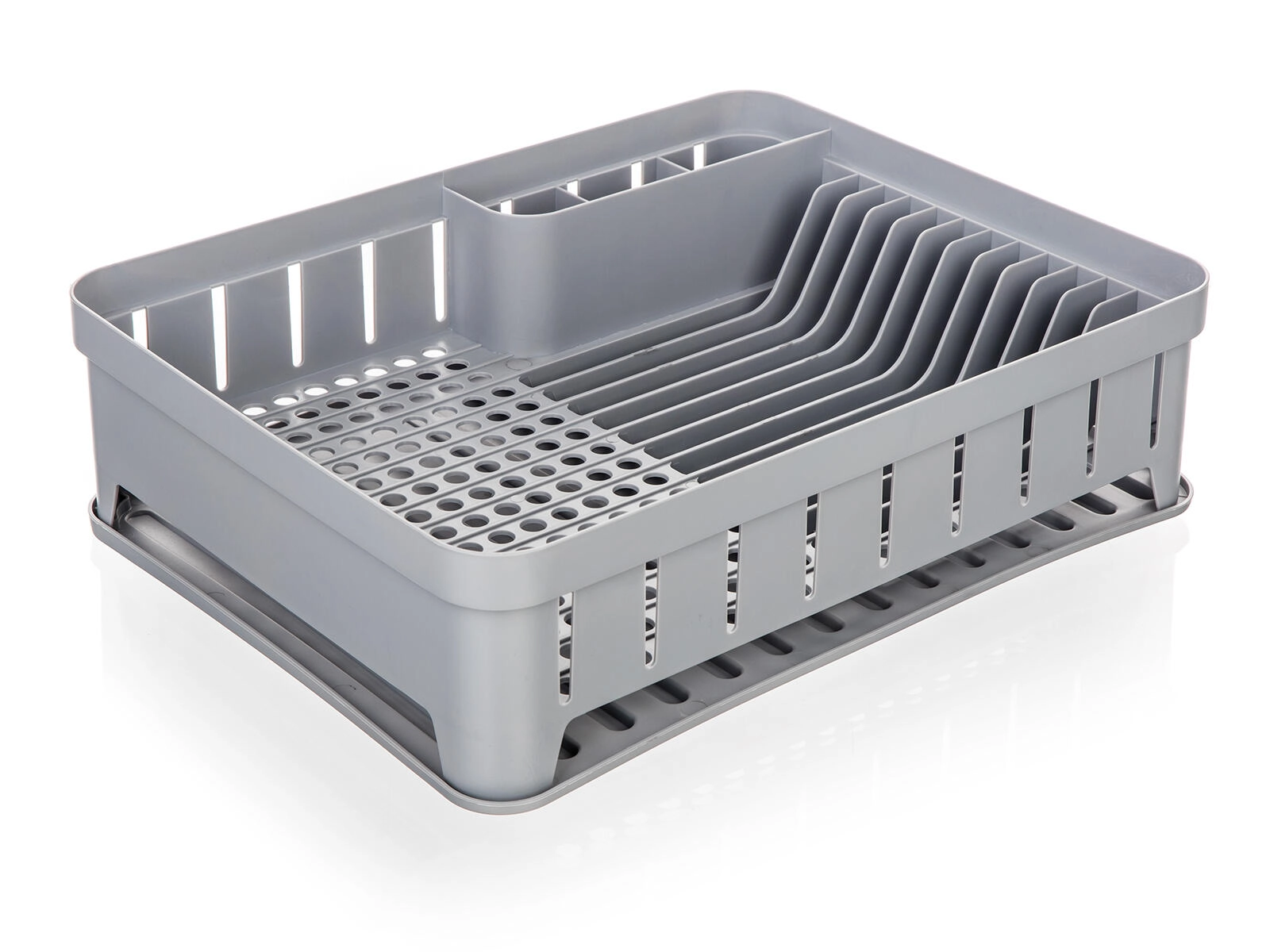 Praktični ocjeđivač posuđa s pladnjem u sivoj boji nudi dimenzije 40 × 31 × 12 cm, pa pruža dovoljno prostora za svakodnevno pranje posuđa. Ima odvojene odjeljke za pribor, tanjure i ostalo posuđe, zahvaljujući čemu je sušenje pregledno i brzo. Izdržljiva plastika lako se čisti, a pladanj skuplja ocijeđenu vodu kako bi kuhinjski pult ostao čist i suh.