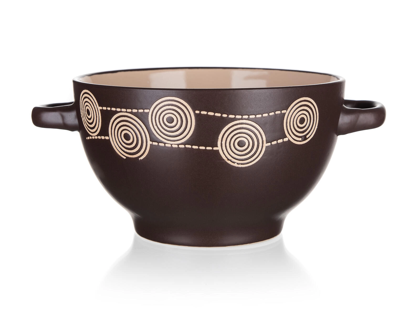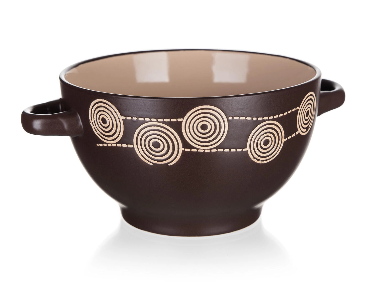 Stilska keramička zdjelica s ručkama i dekorom Spirala u tamno smeđoj boji idealna je za posluživanje juha, mueslija ili tjestenine. Nudi volumen od 660 ml, izdržljiva je i jednostavna za održavanje – može se koristiti u mikrovalnoj pećnici i prati u perilici posuđa. Praktičan promjer 13,5 cm i udobne ručke omogućuju lako prenošenje i svakodnevnu upotrebu.