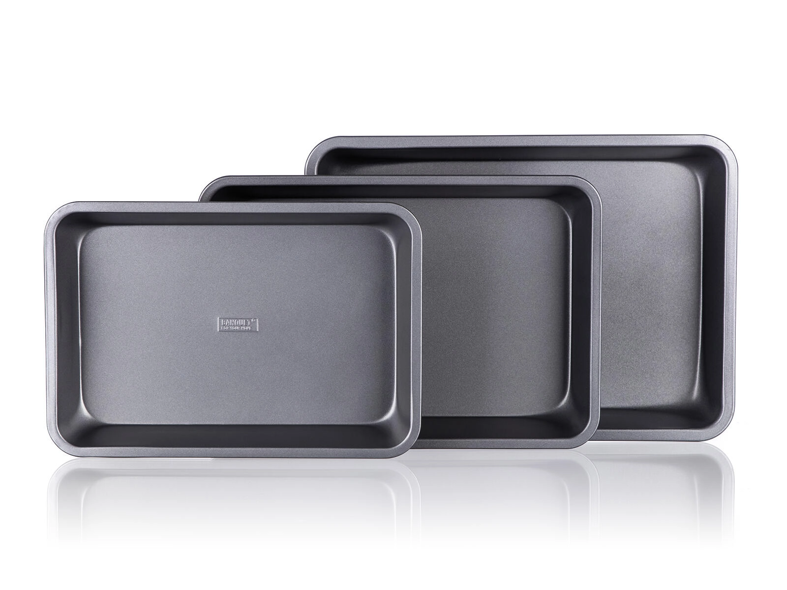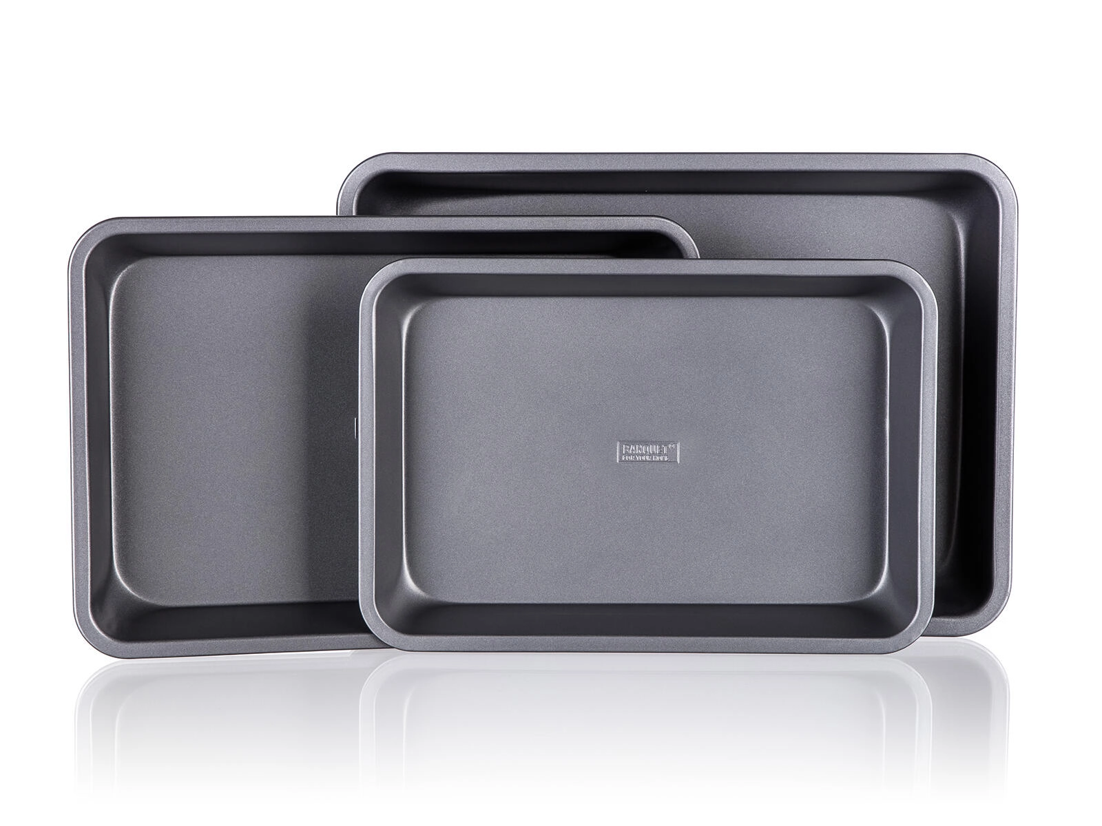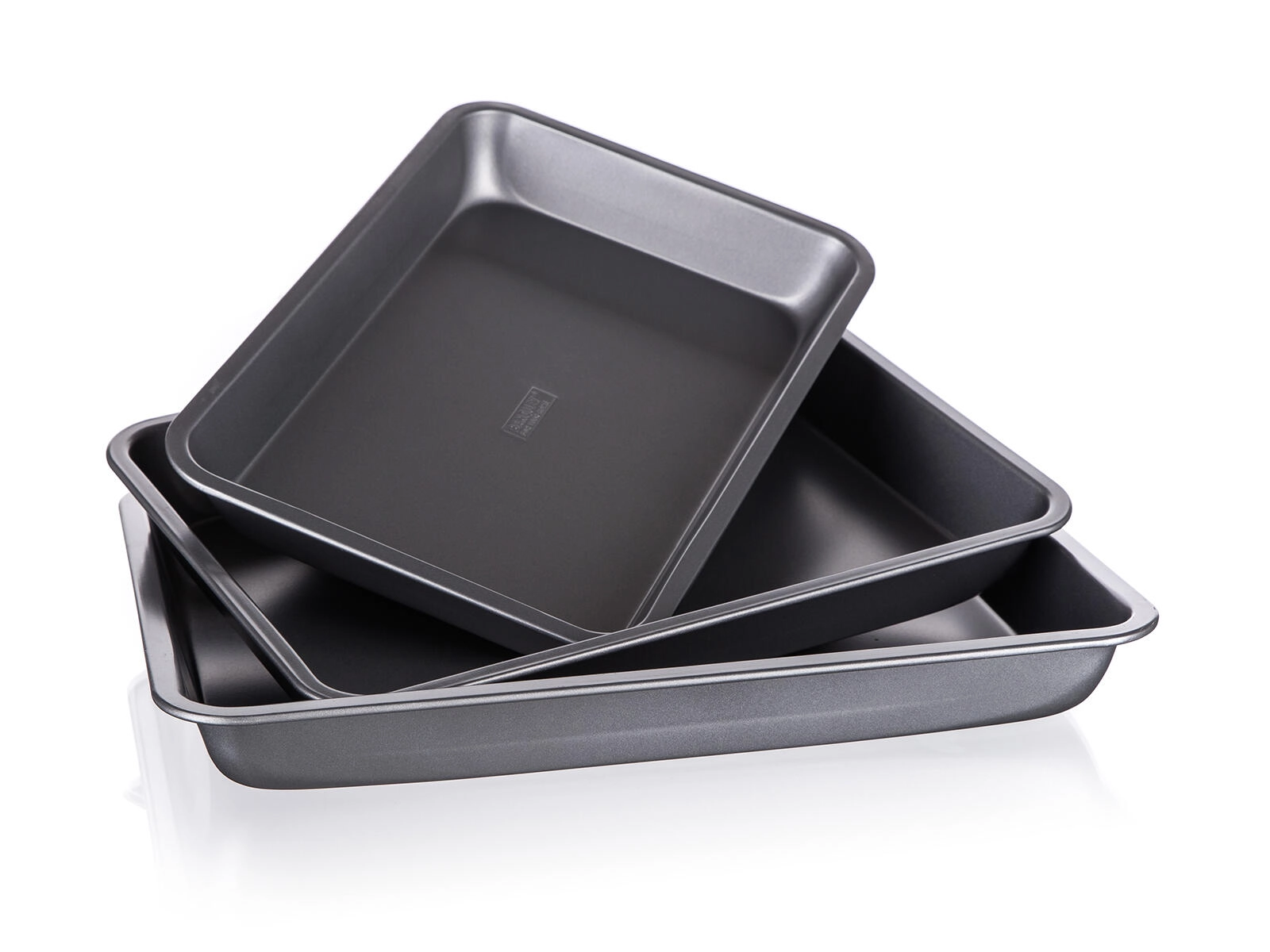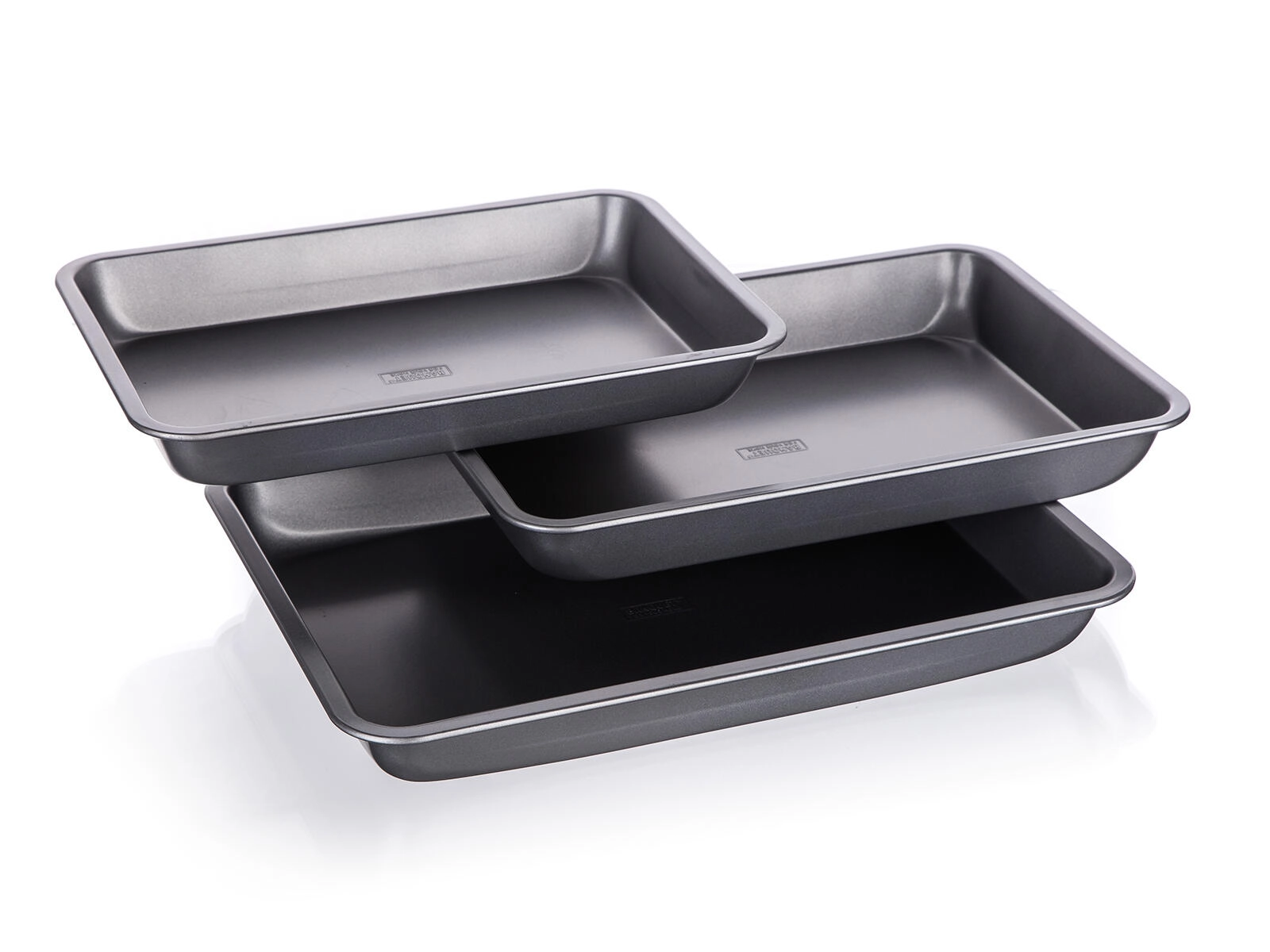 Pladnjevi od čvrstog metala debljine 0,5 mm s povišenim rubovima podnose svakodnevnu uporabu. Nakon pečenja lako ih operete i pohranite uvlačenjem jednog u drugi.
