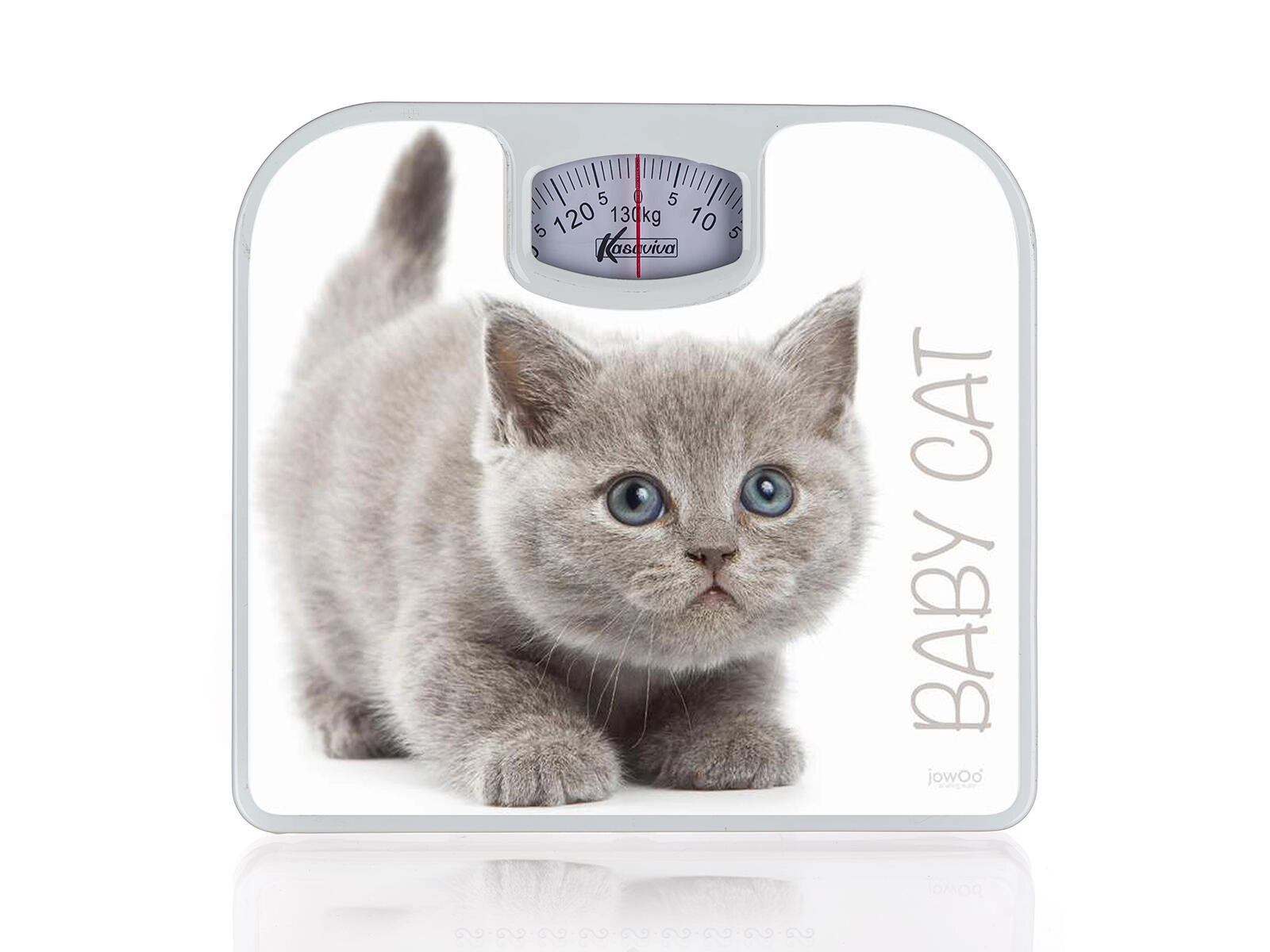 Ova osobna mehanička vaga u bijeloj boji s motivom mačića praktičan je i estetski dodatak kupaonici ili spavaćoj sobi. Zahvaljujući jasnom analognom pokazivaču lako ćete provjeriti svoju težinu bez potrebe za baterijama. Metalna izrada jamči stabilnost i dugi vijek trajanja.