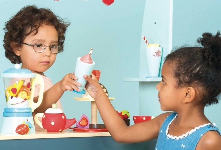Ovaj stilski drveni set iz kolekcije Honeybake pretvara svaku dječju kuhinjicu u smoothie bar. Djeca mogu sigurno “rezati” voće na čičak, napuniti posudu miksera i poslužiti ukusne napitke u dvije čaše sa slamkom. Realistični detalji potiču igru uloga, razvoj fine motorike i kognitivnih vještina.