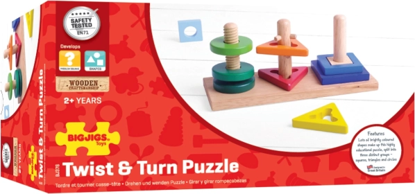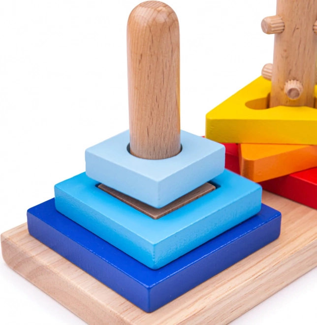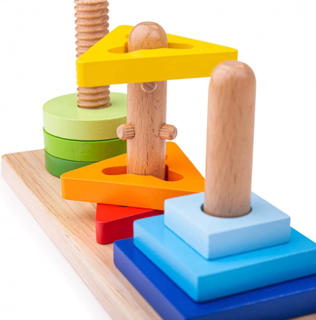 Ova pametna drvena igračka motivira djecu na otkrivanje. Dijelovi se stavljaju na tri različita kolčića, pri čemu neki zahtijevaju okretanje ili pravilnu orijentaciju. Djeca tako prirodno vježbaju spretnost prstiju, strpljenje i prostornu predodžbu.