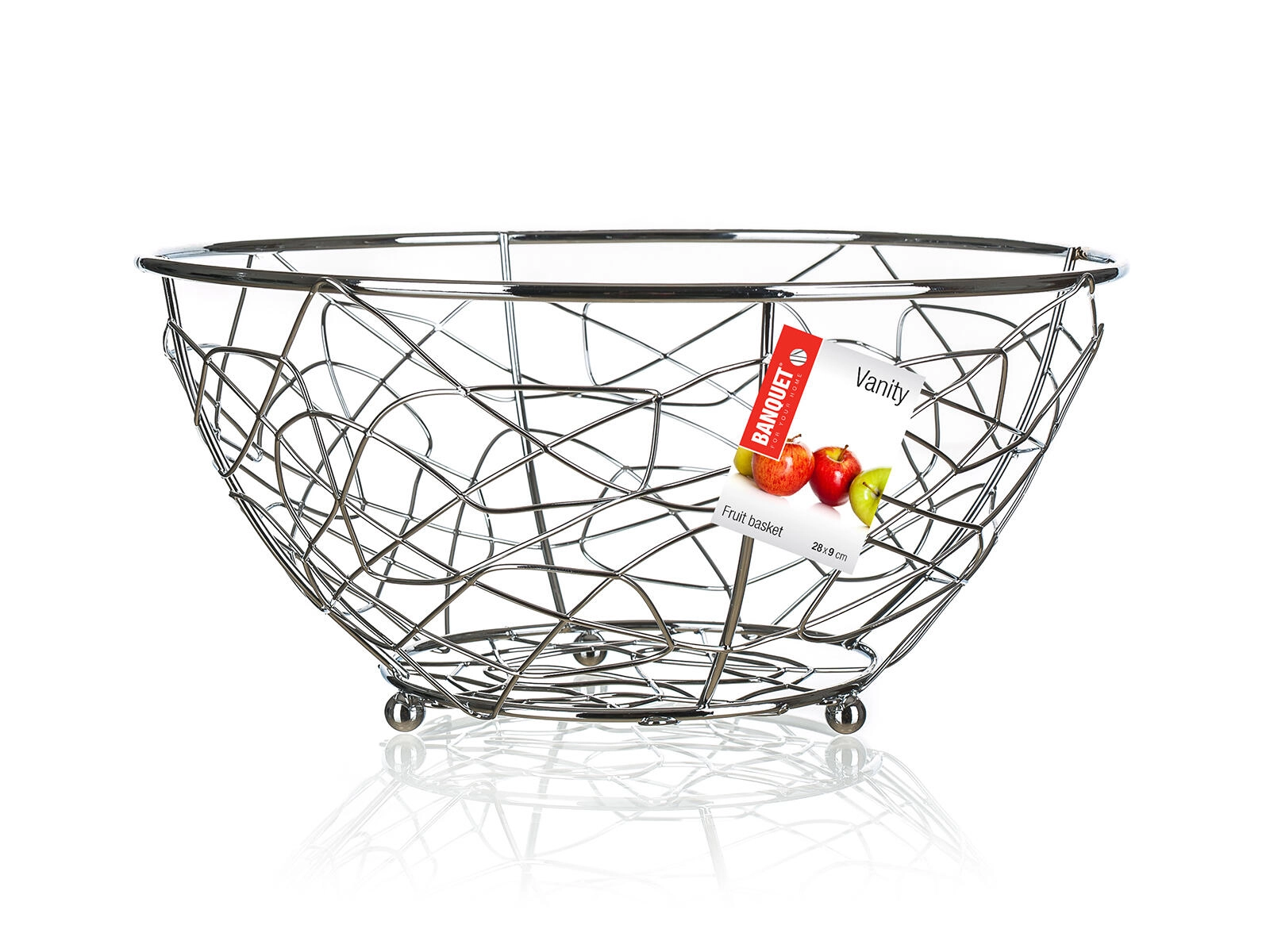 Stilska žičana košara za voće Banquet VANITY s promjerom 23 cm i visinom 11 cm idealna je za pregledno odlaganje voća i peciva. Otvorena konstrukcija osigurava optimalnu cirkulaciju zraka, zahvaljujući čemu namirnice dulje ostaju svježe. Kvalitetna metalna izrada s kromiranom površinom lako se održava i elegantno nadopunjuje svaku kuhinjsku radnu ploču ili blagovaonski stol.