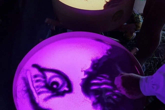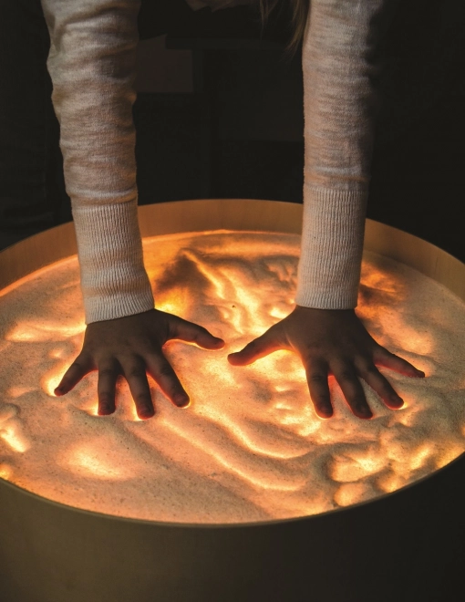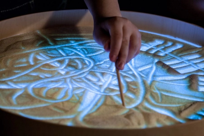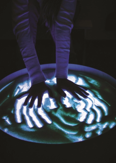 Na ploči se može crtati prstima, kistovima i plastičnim alatima, raditi s pijeskom, kamenčićima i drugim materijalima bez brige o neredu zahvaljujući povišenom rubu. Stol služi i kao svjetlosna scena za malo kazalište, ukrasna rasvjeta dječje sobe ili terapijski alat za razvoj percepcije boja, oblika i uzoraka.
