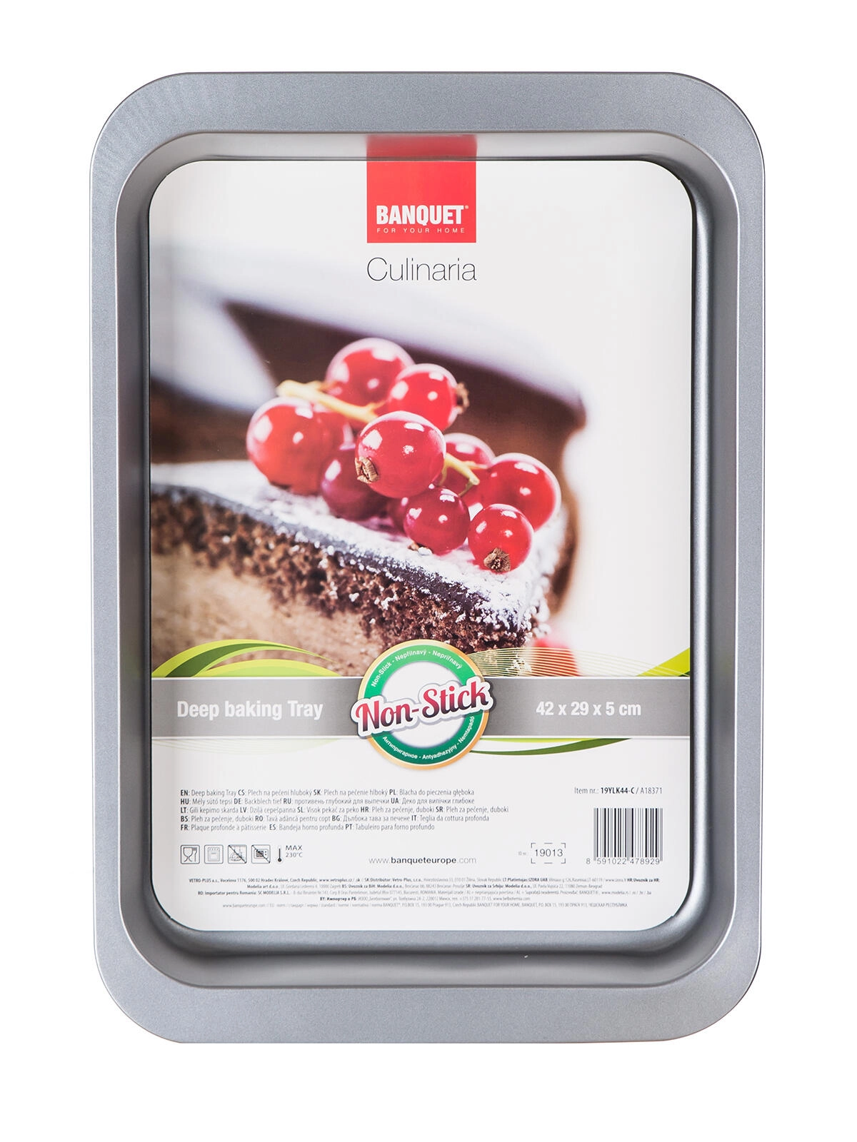 Univerzalan duboki pekač CULINARIA dimenzija 42 × 29 × 5 cm idealan je za slatka i slana jela. Izrađen od izdržljivog ugljičnog čelika s neljepljivom površinom XYNFLON na bazi PTFE-a za lako vađenje i brzo čišćenje. Elegantno srebrnosivo izvedenje i robustna debljina 0,5 mm osiguravaju dugi vijek trajanja i ravnomjerno pečenje.