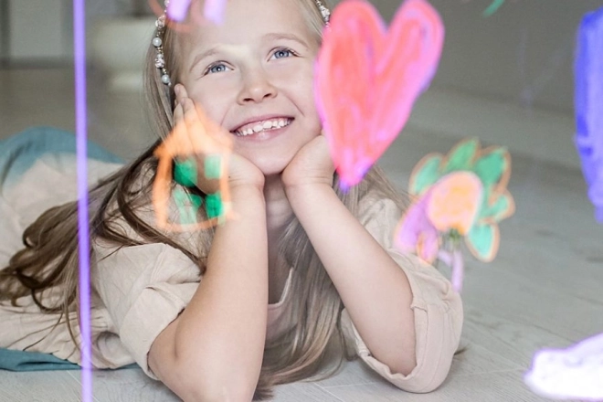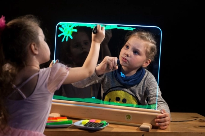 Izdržljiva ploča od kaljenog stakla podnosi dječje oduševljenje i omogućuje slikanje vodenim bojama, prstima i perivim flomasterima. Crtati se može s obje strane, pa se djeca mogu izmjenjivati ili stvarati zajedno.