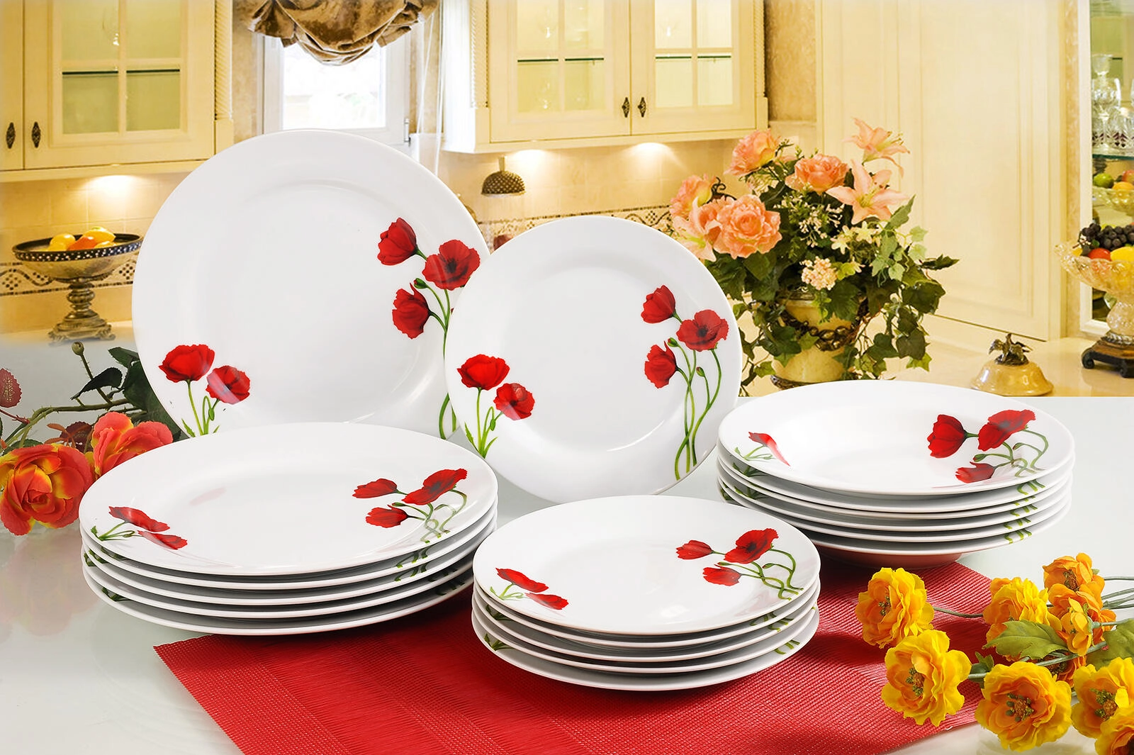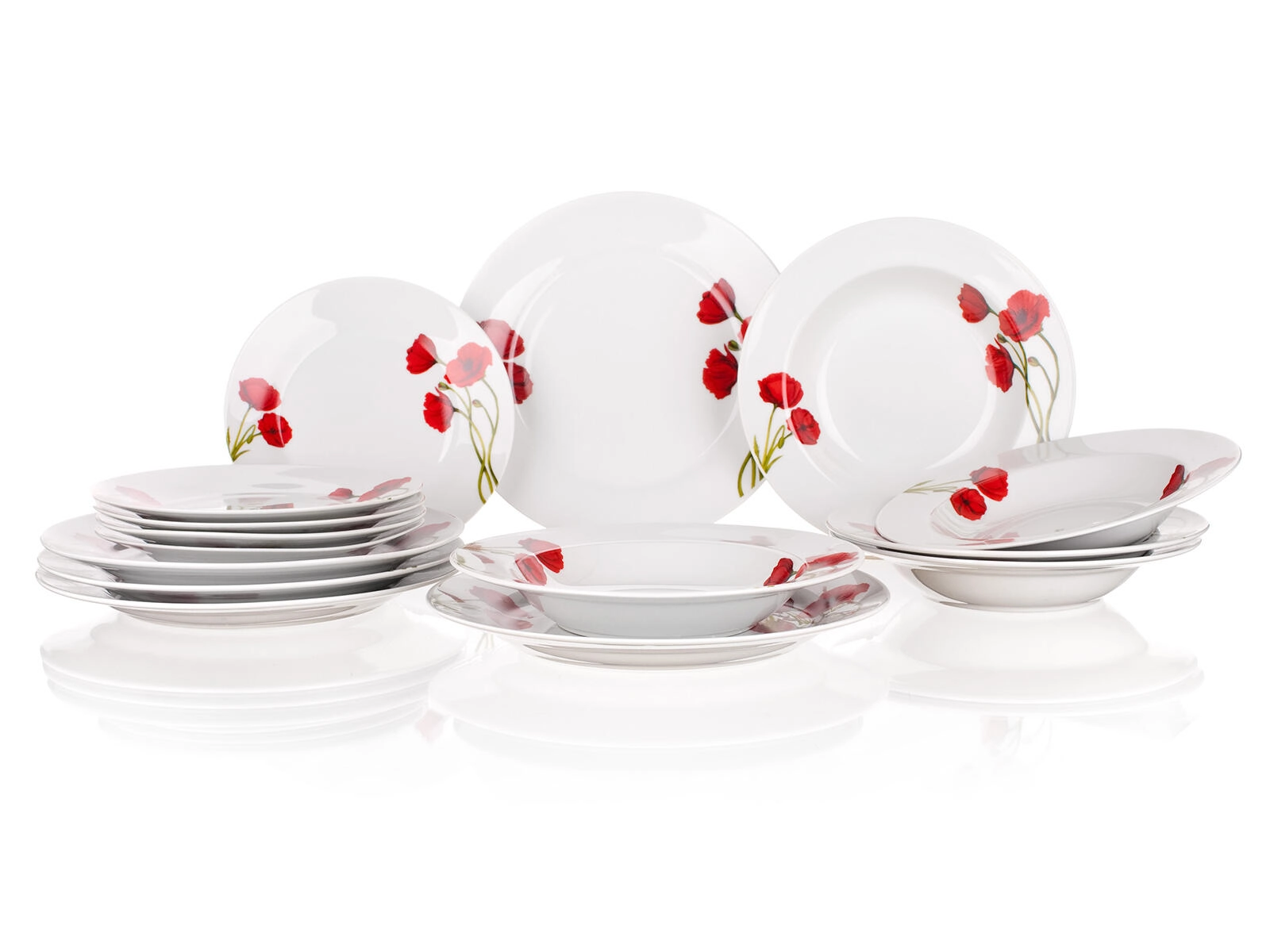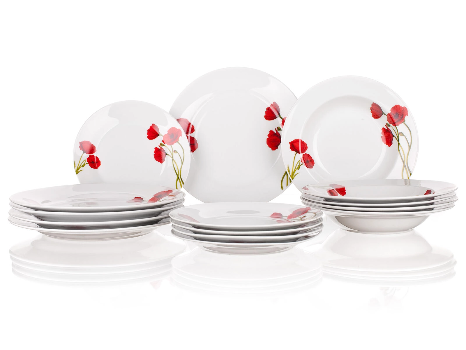 Elegantni 18-dijelni porculanski blagovaonski set POPPY s dekorom makova unosi svjež šarm u svako posluživanje. Sadrži desertne, plitke i duboke tanjure za potpuni servis. Zahvaljujući sjajnoj glaziranoj površini lako se čisti, pogodan je za perilicu posuđa i mikrovalnu pećnicu.