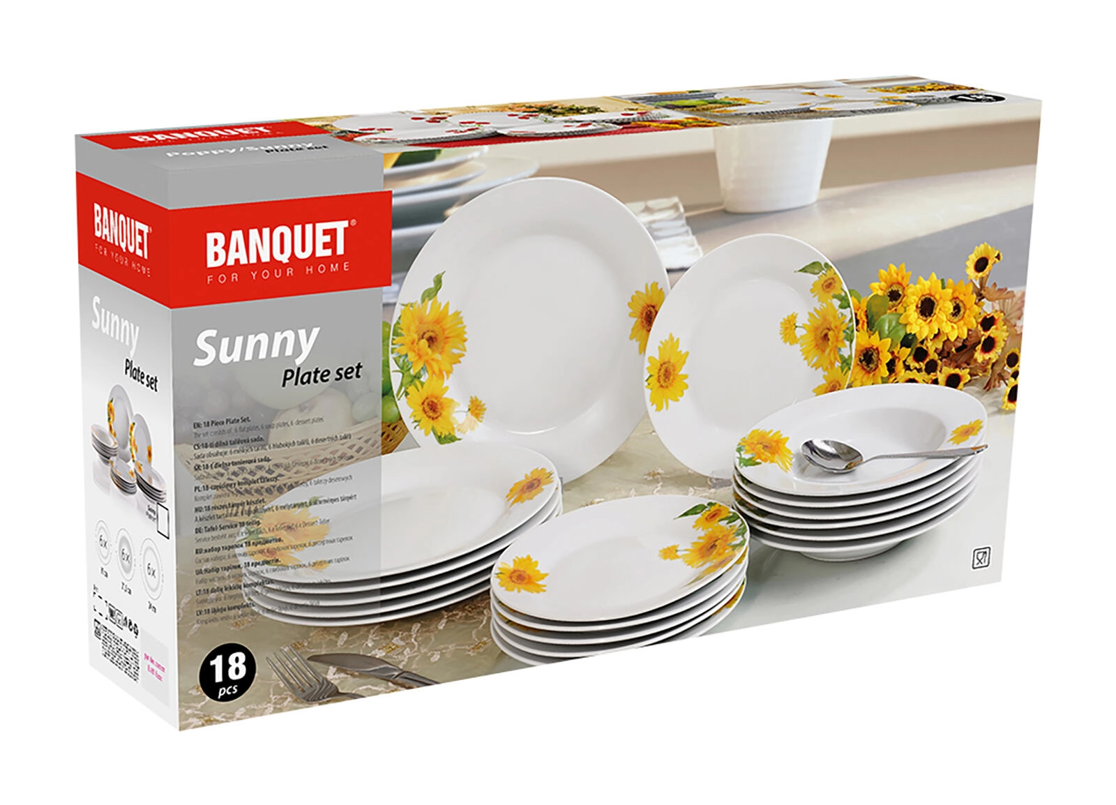 Set za blagovanje SUNNY u bezvremenskoj bijeloj boji sa suncokretima unosi radost i svježinu u dom. Kvalitetan porculan osigurava ugodno blagovanje, izdržljivost i jednostavno održavanje, dok sjajna glazura naglašava estetski dojam.
