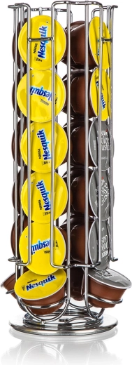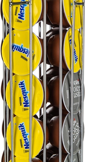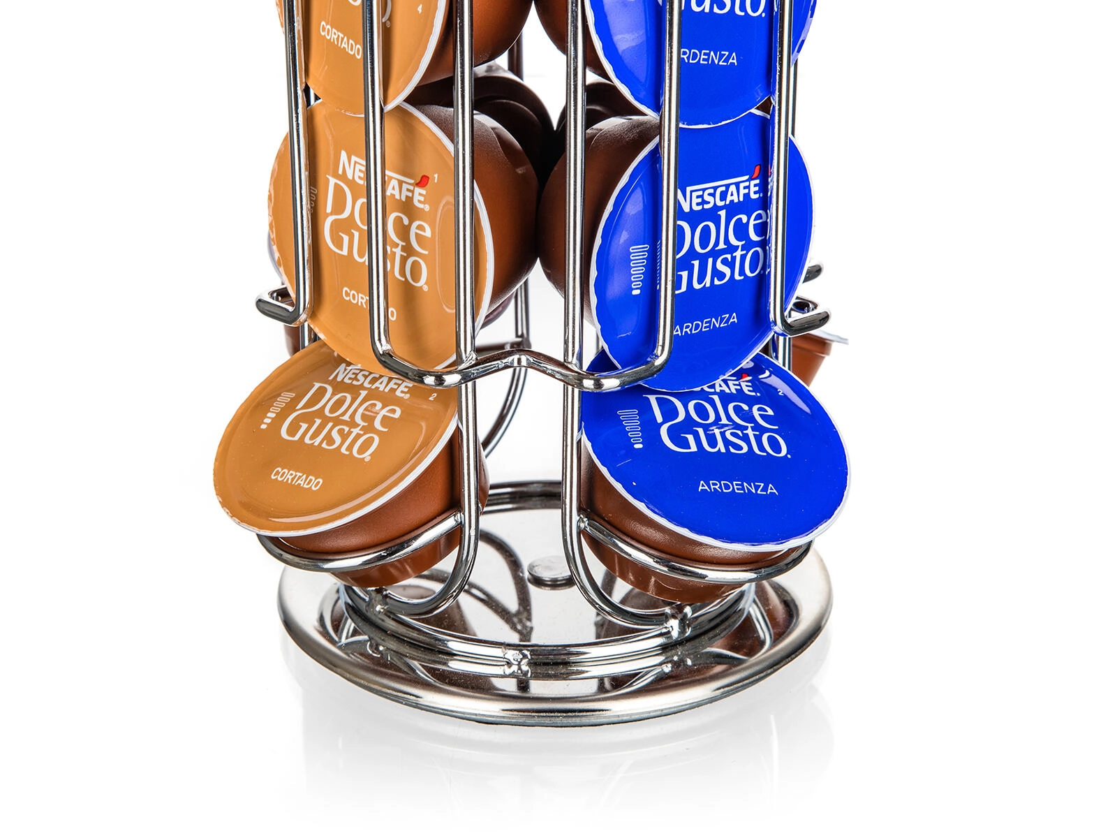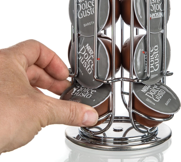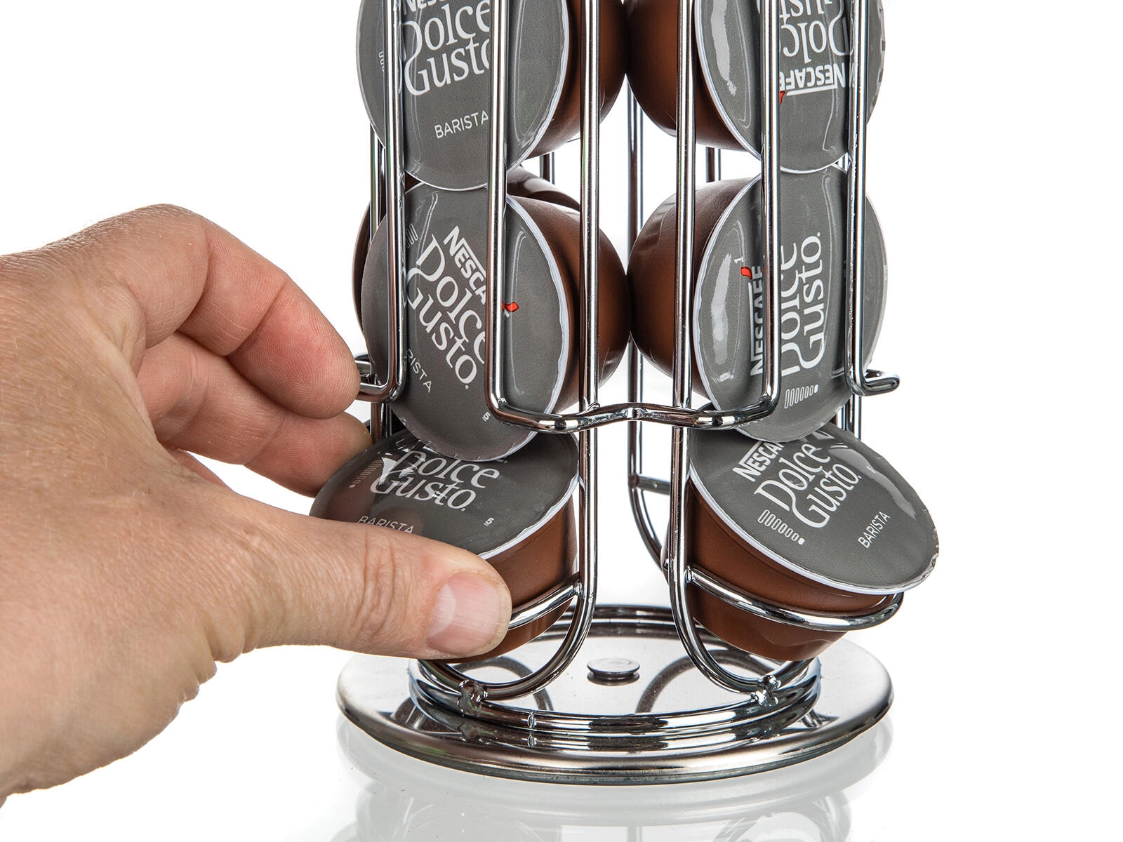 Praktičan i elegantan držač za kapsule za sustav DOLCE GUSTO s kapacitetom 24 kapsule. Okretna karuselna baza omogućuje brz odabir okusa, čelična konstrukcija osigurava stabilnost i izdržljivost, a nadopunjavanje i uzimanje odvija se praktično s donje strane.