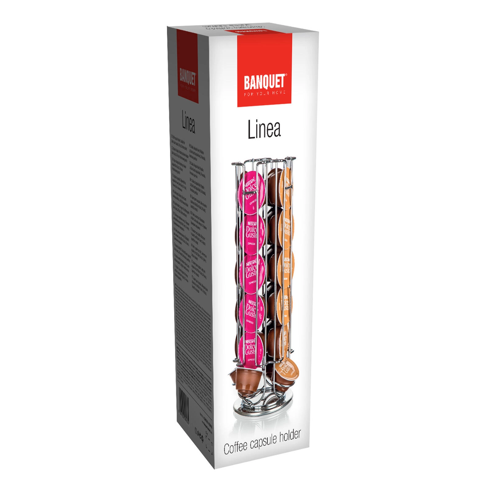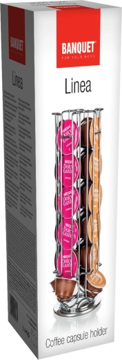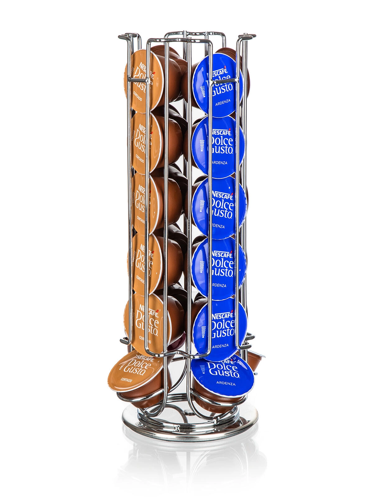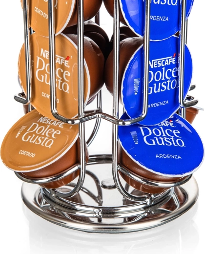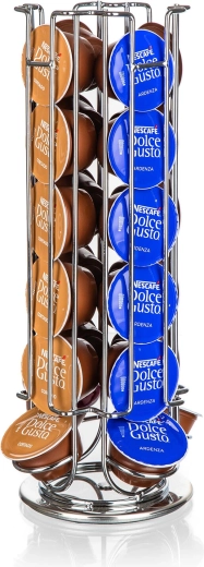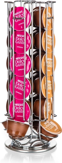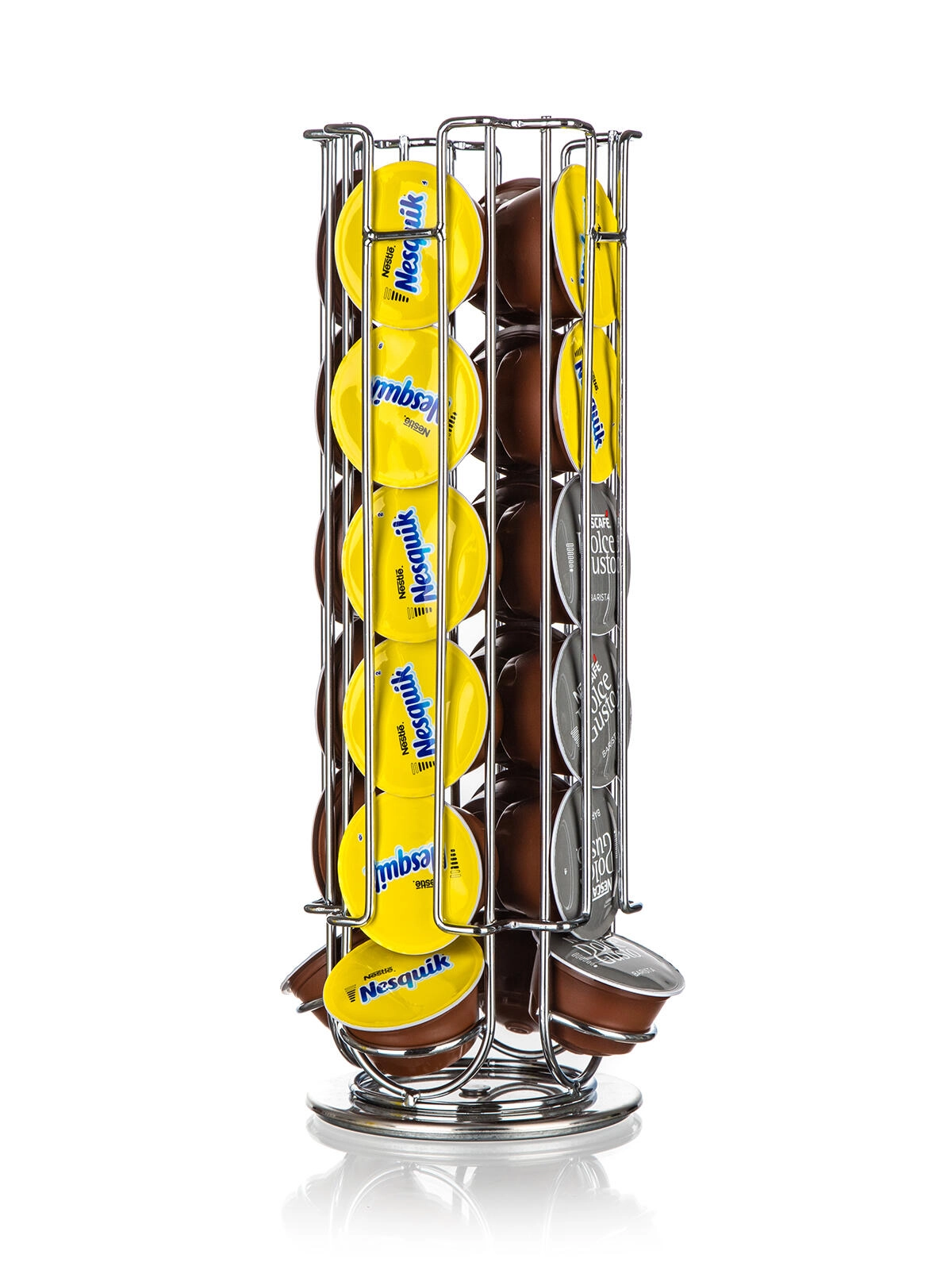 Praktičan i elegantan držač za kapsule za sustav DOLCE GUSTO s kapacitetom 24 kapsule. Okretna karuselna baza omogućuje brz odabir okusa, čelična konstrukcija osigurava stabilnost i izdržljivost, a nadopunjavanje i uzimanje odvija se praktično s donje strane.