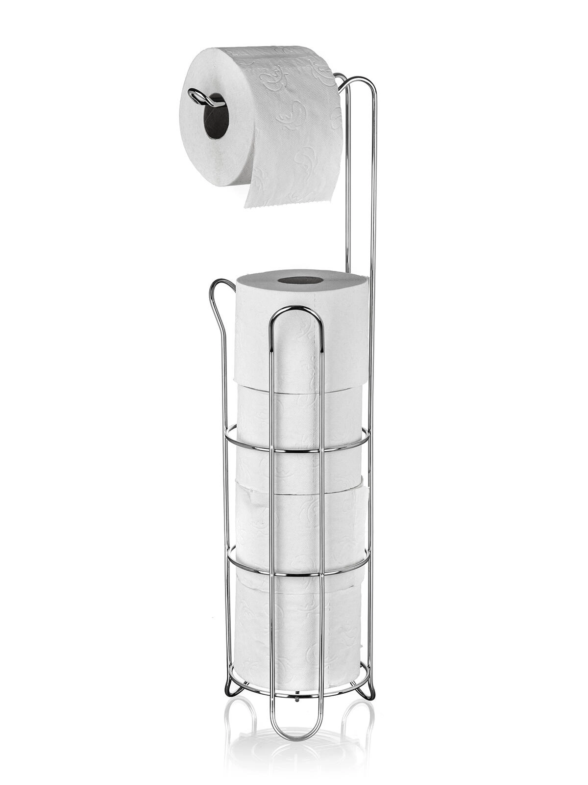 Elegantni stalak za toaletni papir s držačem u kromiranoj izvedbi spaja praktično pohranjivanje do 4 role (3 u stalku + 1 na držaču) s uštedom prostora. Stabilna metalna konstrukcija s sjajnom završnom obradom daje vašoj kupaonici moderan izgled i omogućuje lak pristup rolama kad god zatrebate.