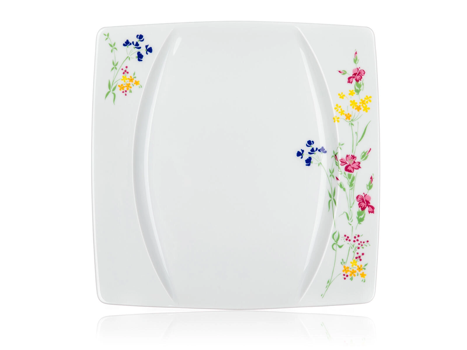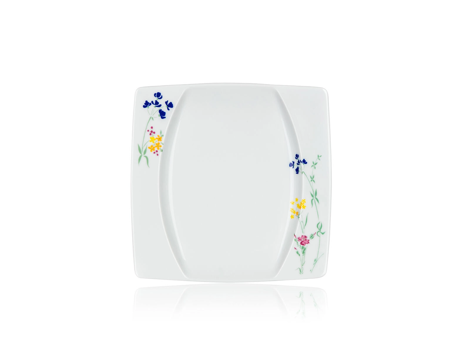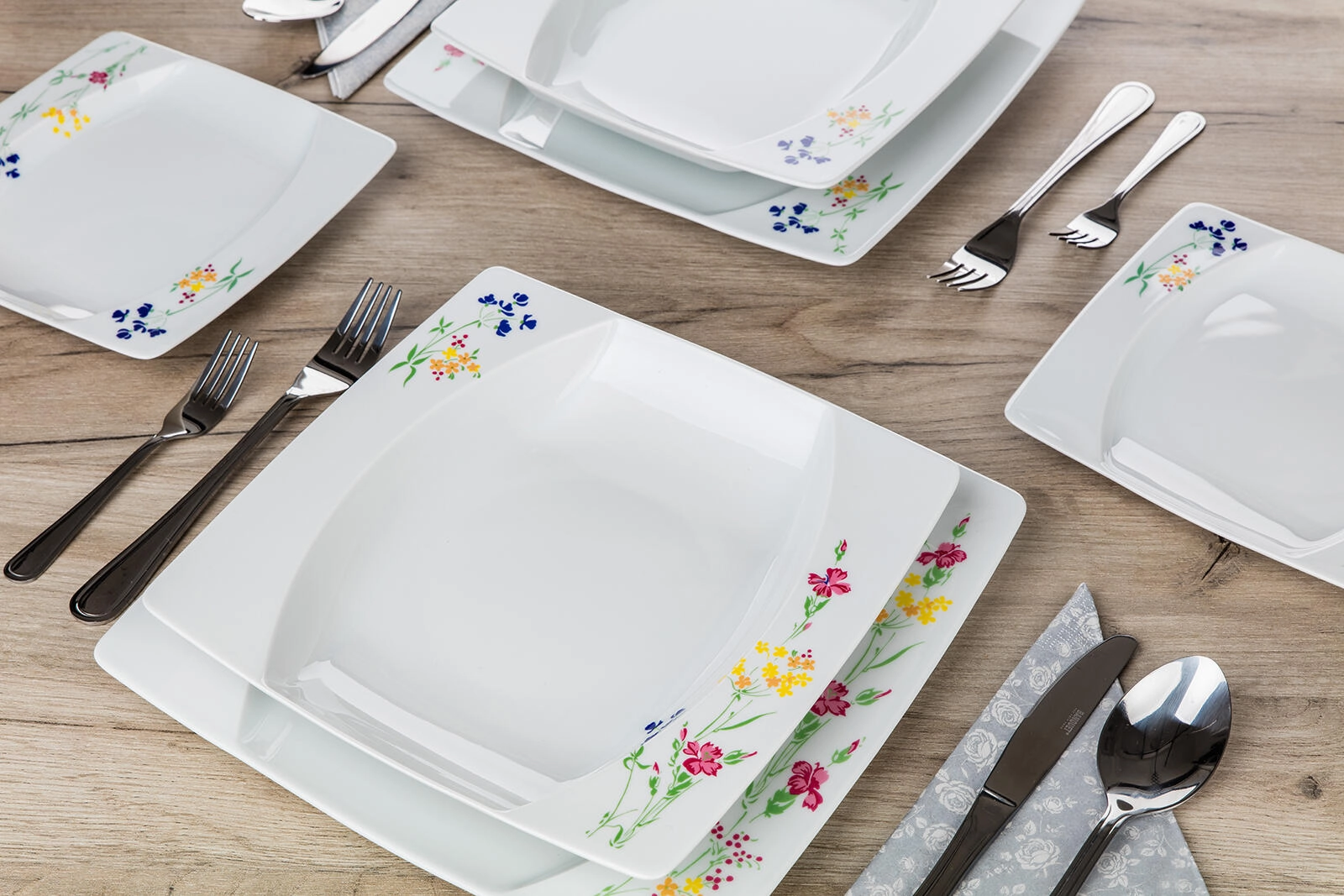 Stilski četvrtasti tanjuri s nježnim cvjetnim tiskom u kutevima daju postavci osobit karakter i lako se kombiniraju s ostalim posuđem.