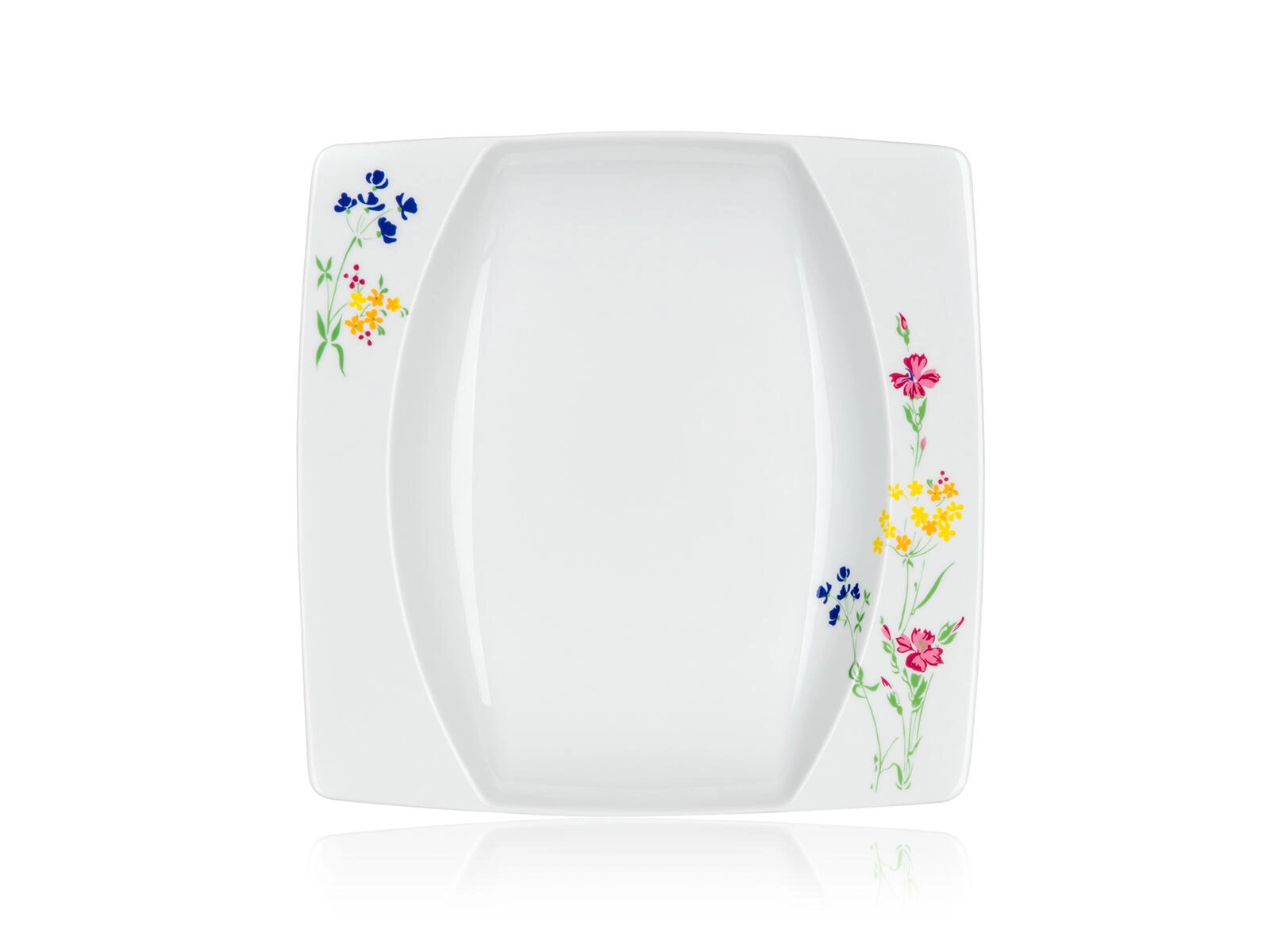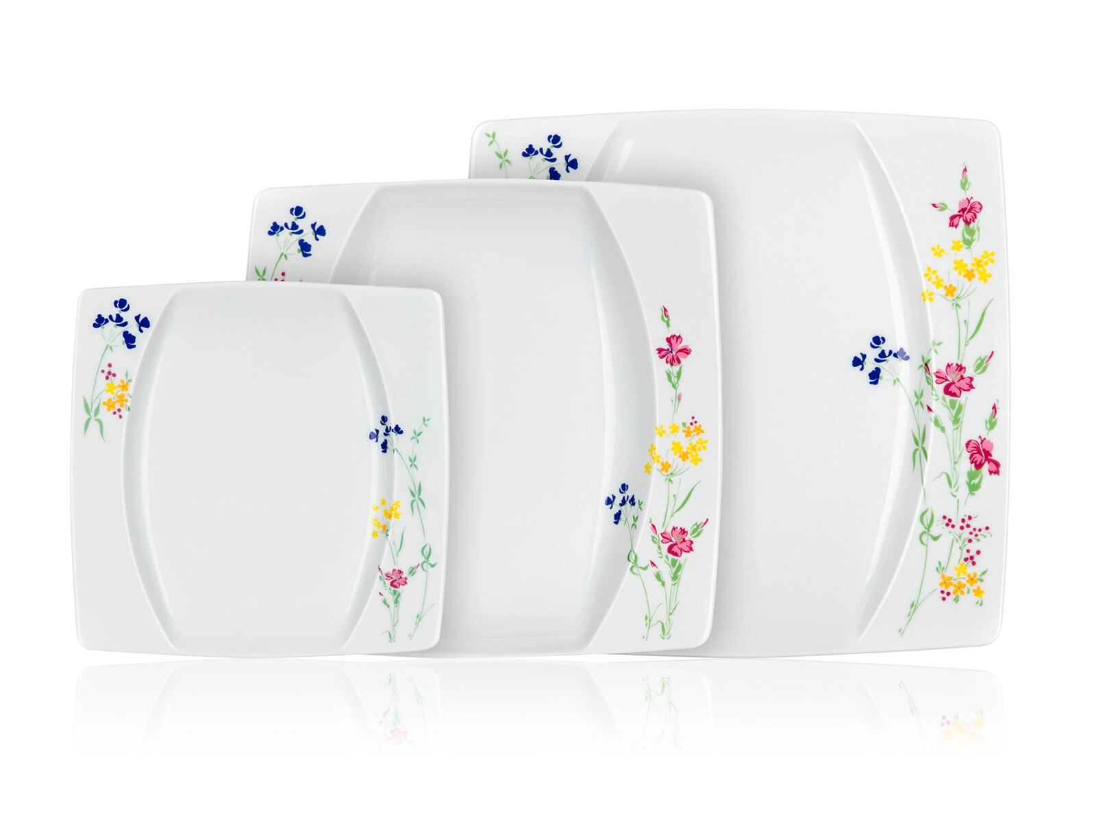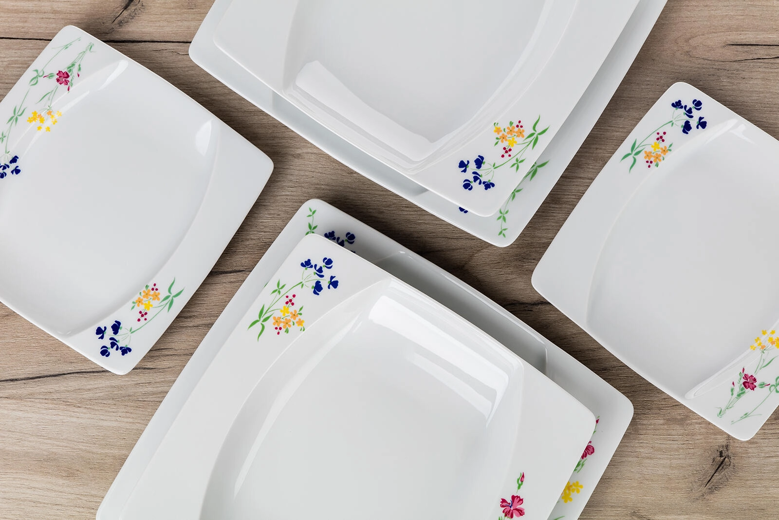 Stilski četvrtasti tanjuri s nježnim cvjetnim tiskom u kutevima daju postavci osobit karakter i lako se kombiniraju s ostalim posuđem.