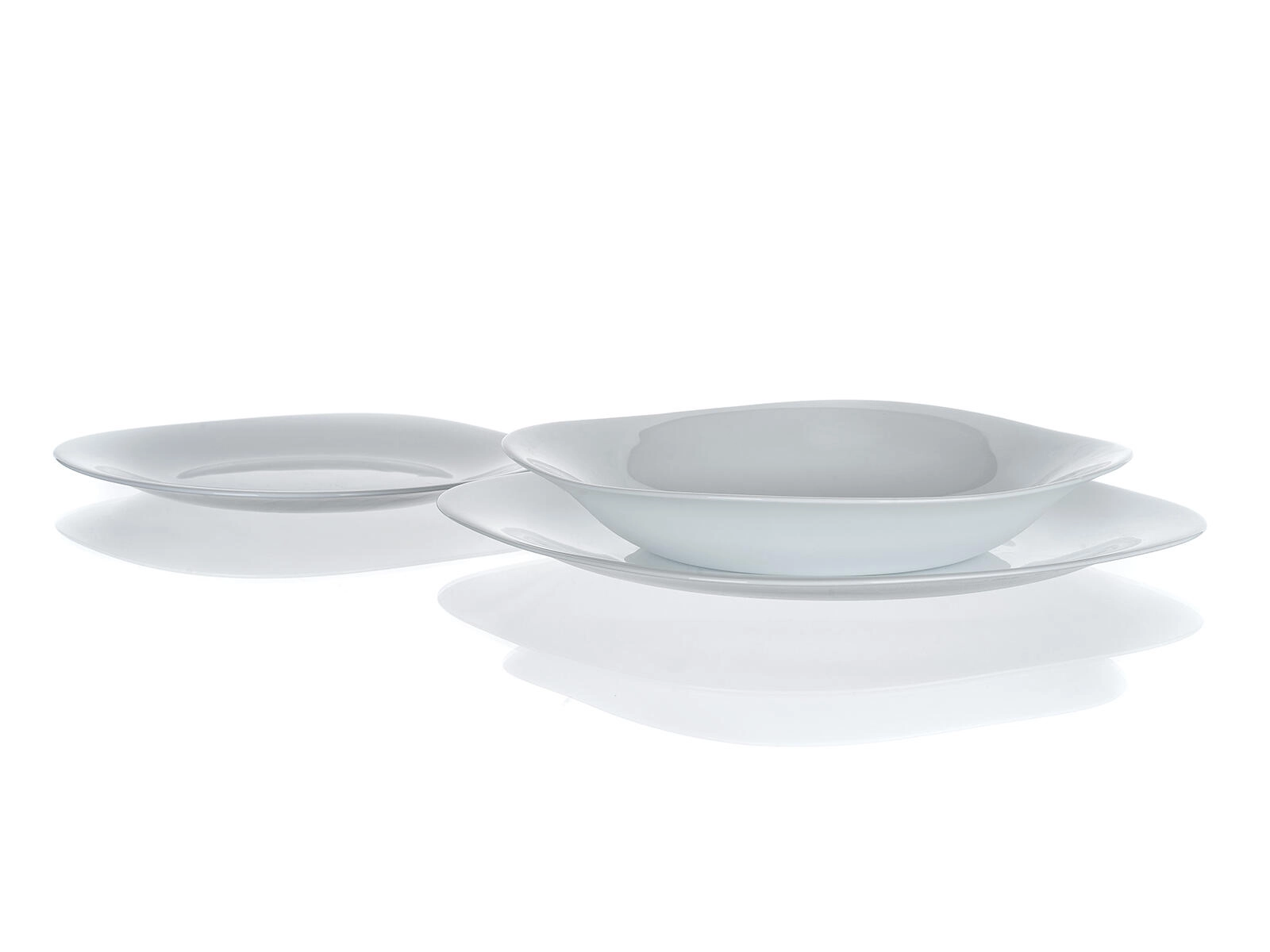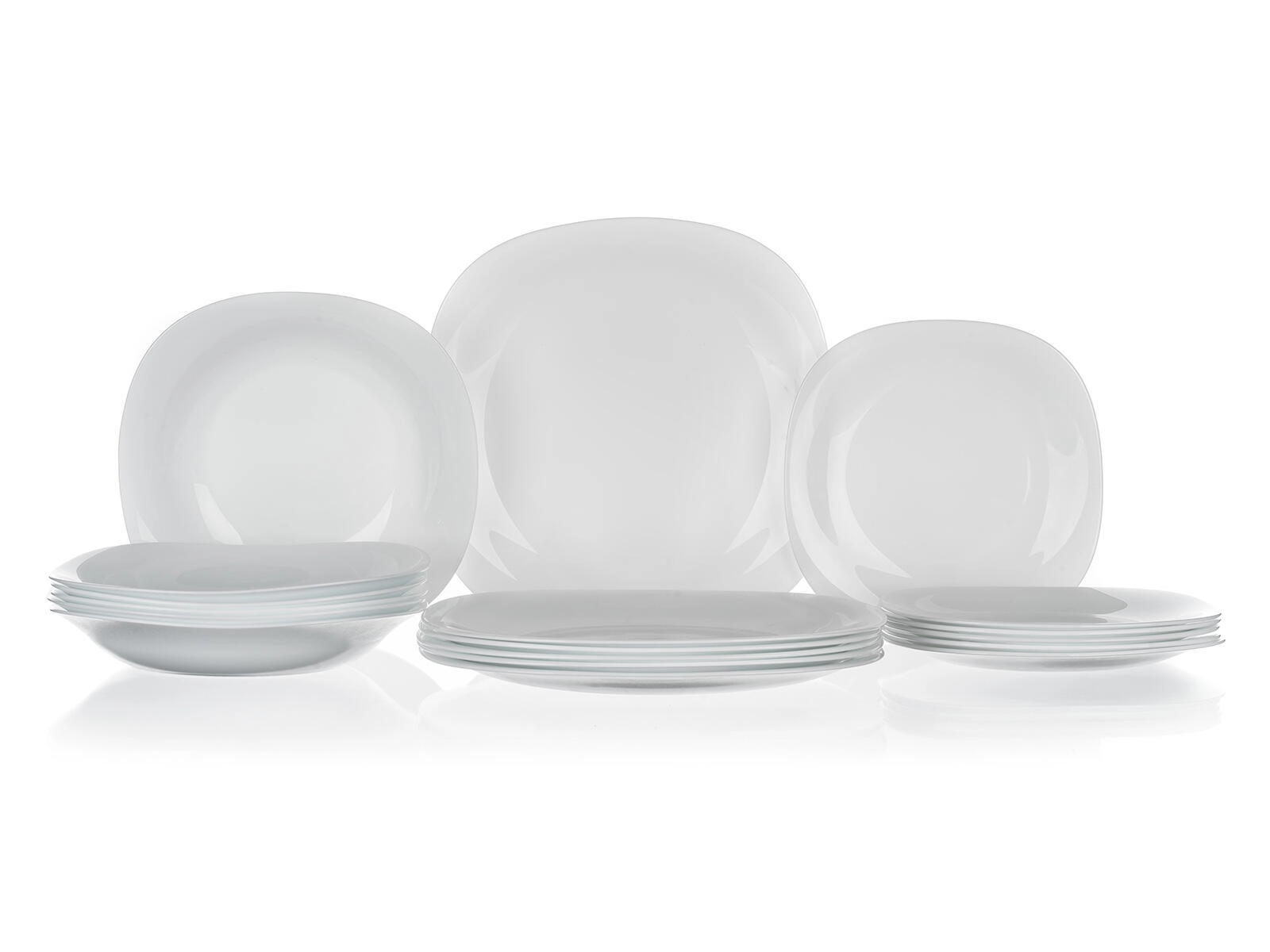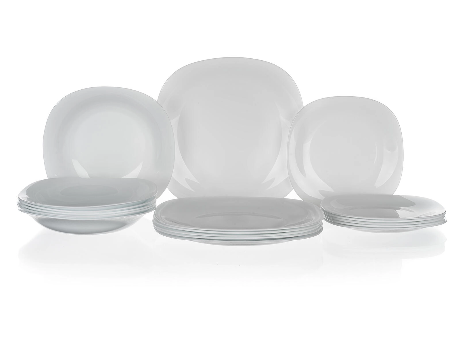 Ovaj 18-dijelni set tanjura PARMA u bijeloj boji spaja minimalistički izgled s maksimalnom praktičnošću. Kvadratni oblik s nježno zaobljenim kutovima daje vašem stolu moderan dojam i lako se kombinira s ostalim posuđem. Kvalitetno staklo osigurava dug vijek trajanja i jednostavno održavanje.