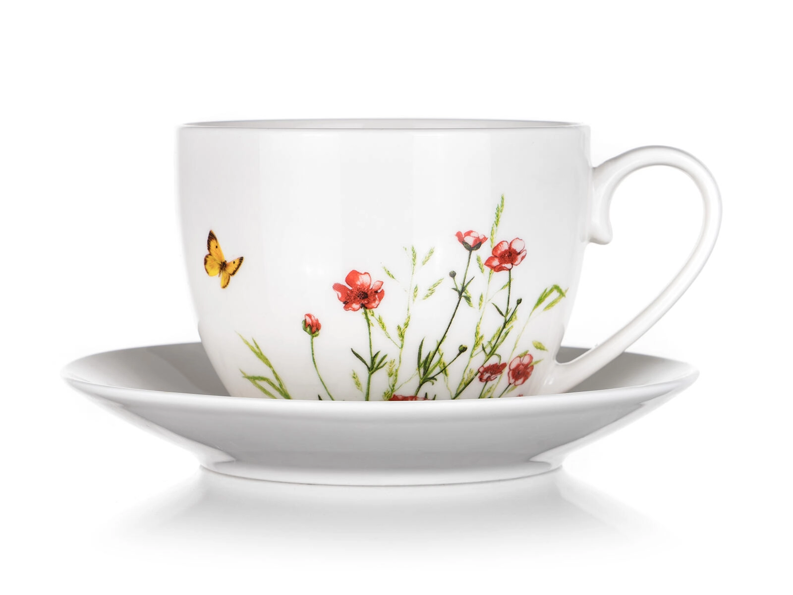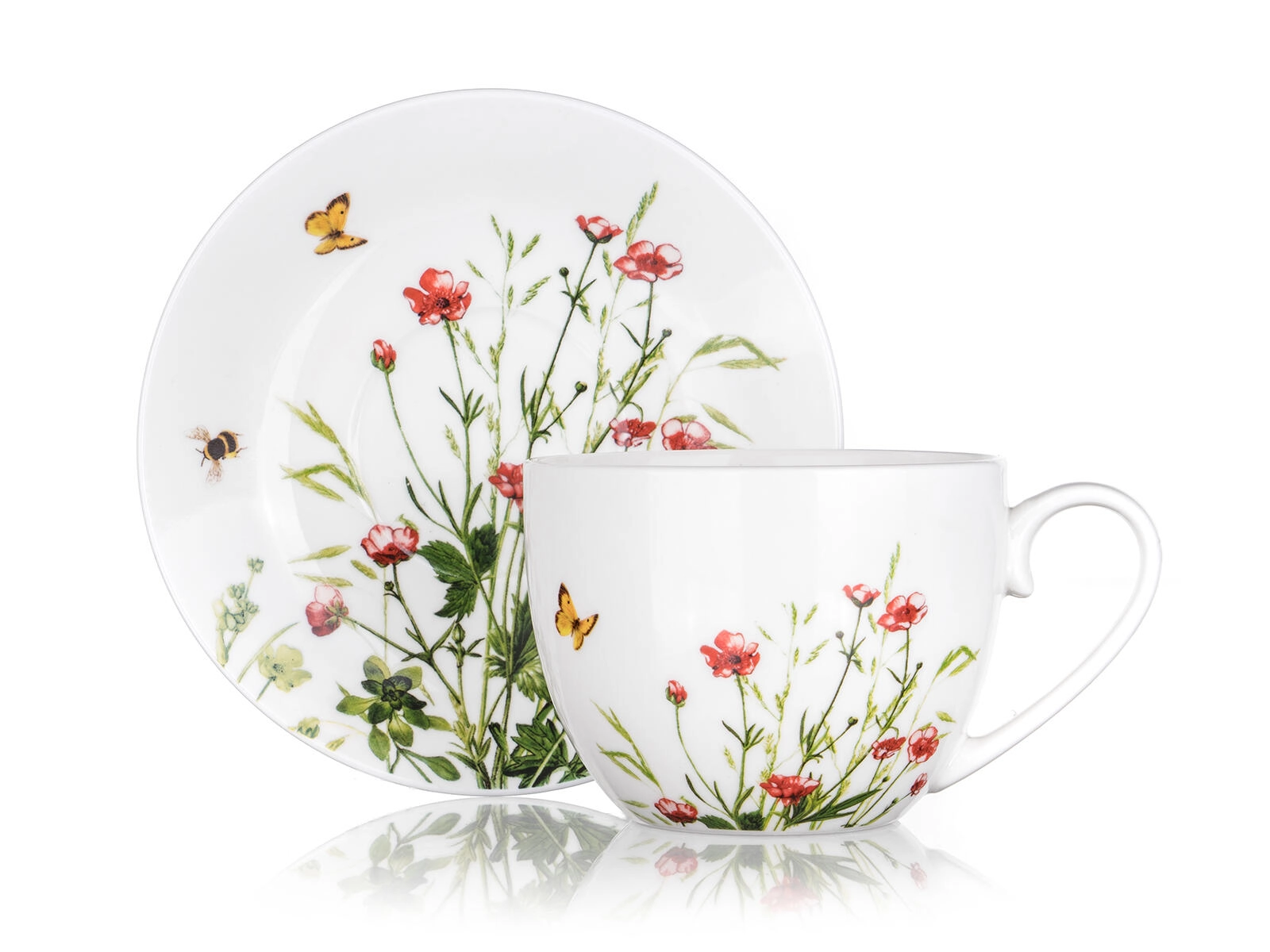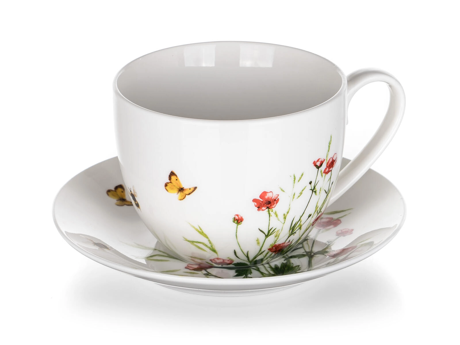 Uživajte u omiljenom napitku u šalici MEADOW s nježnim motivom livadnog cvijeća i leptira. Bijela glazura i dekor daju posluživanje elegantan dojam te se lako uklapaju u moderne i tradicionalne kuhinje. Set sadrži šalicu s udobnom drškom i savršeno pristajući tanjurić za stabilno odlaganje bez kapljica.