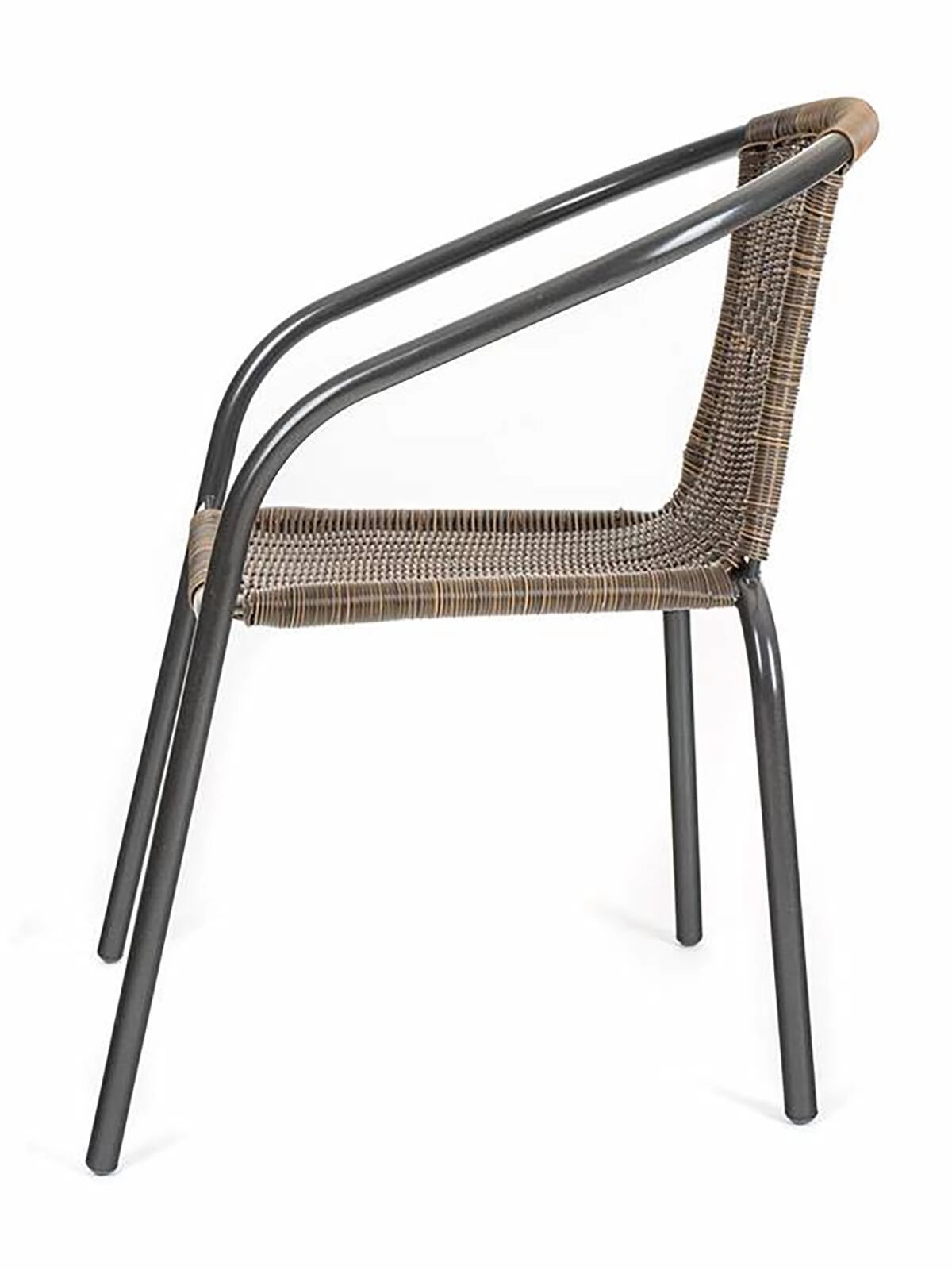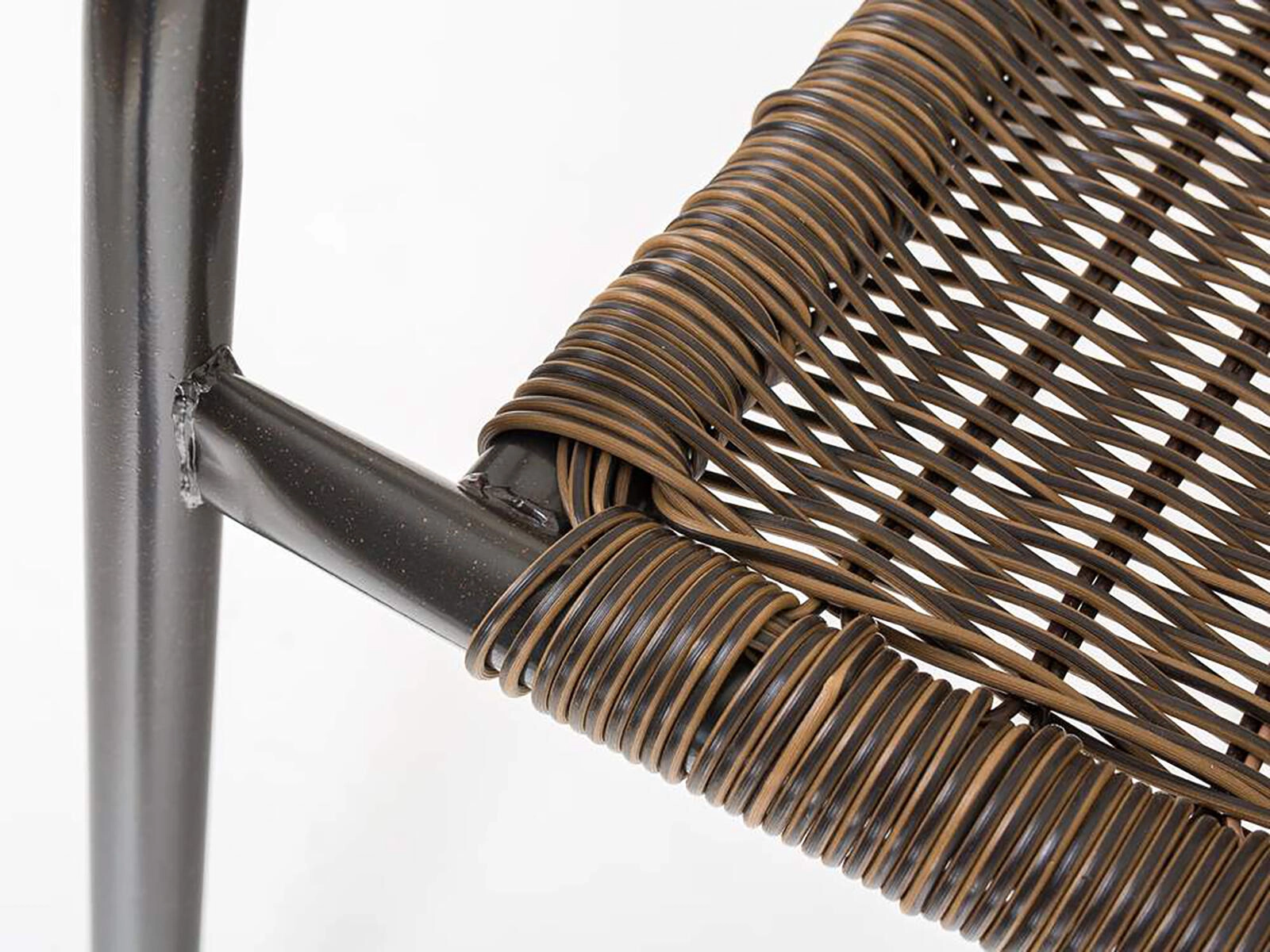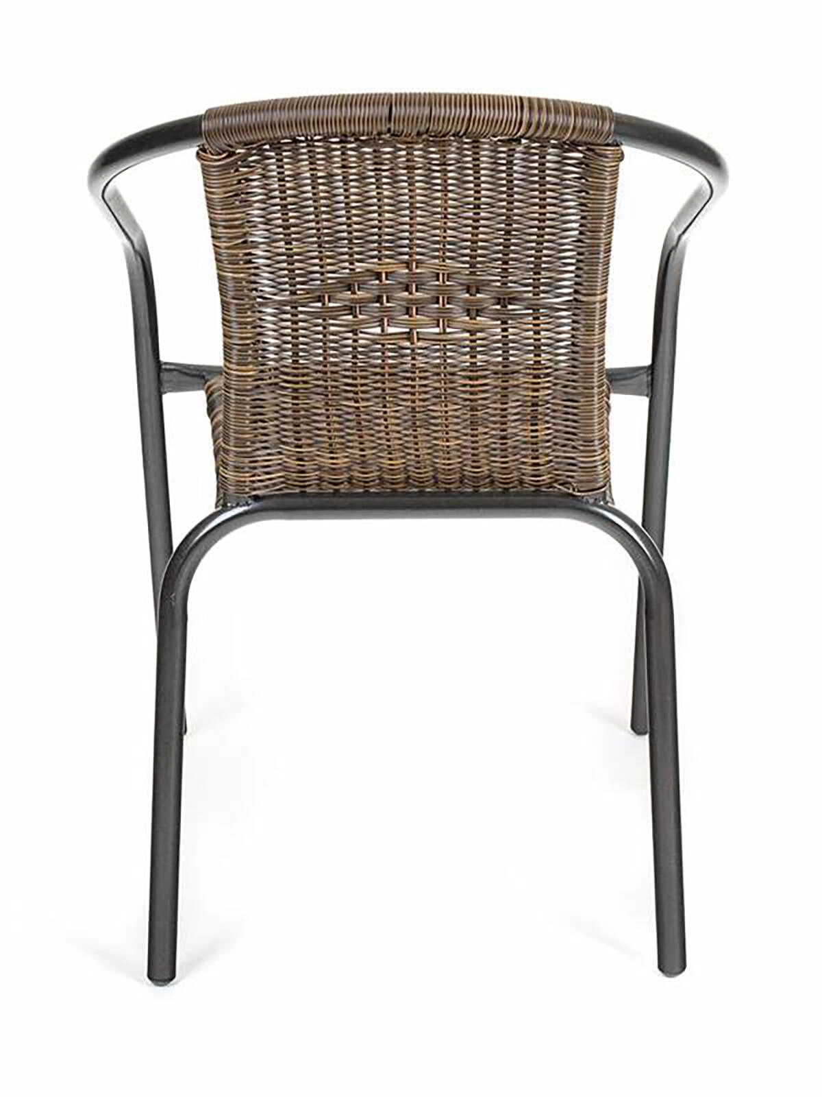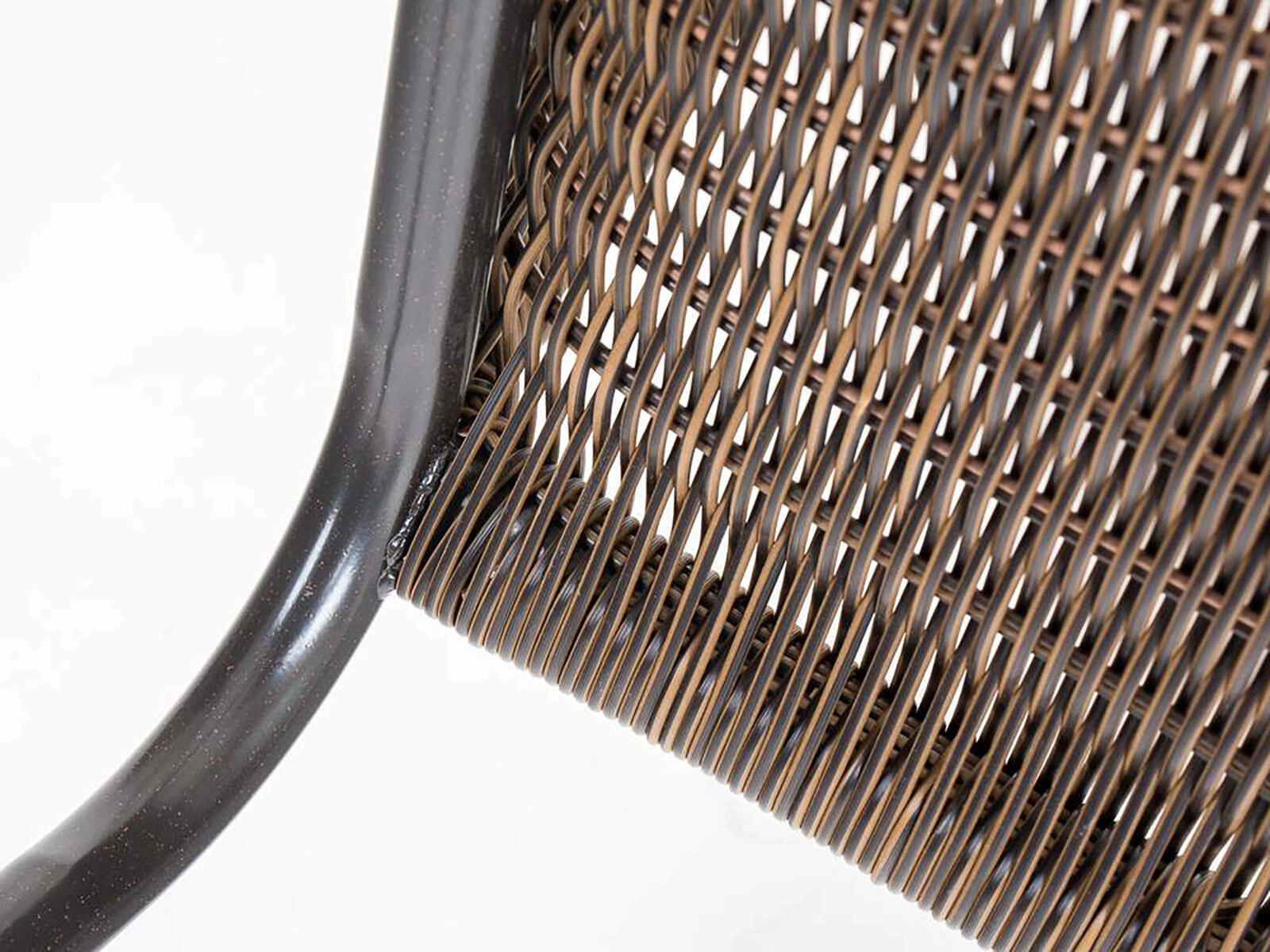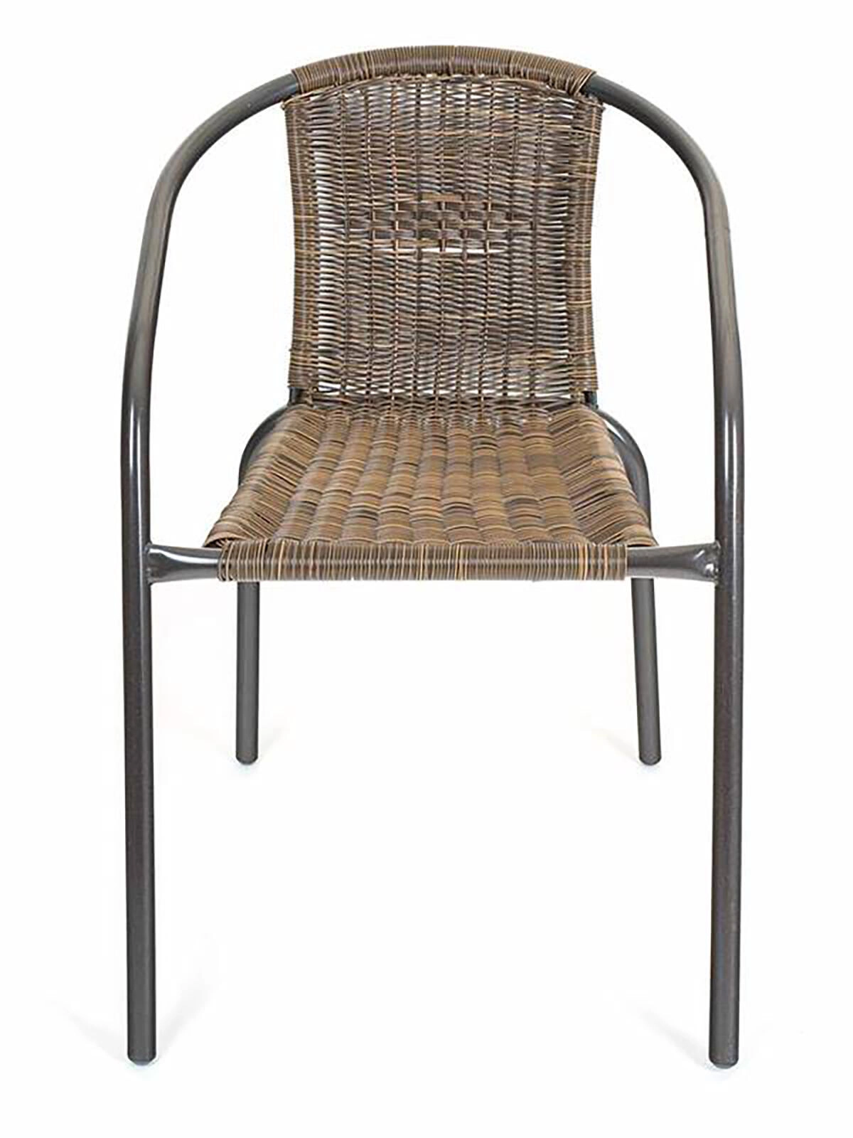Ova svestrana vanjska stolica spaja prozračni izgled ispleta s čvrstoćom čelične konstrukcije. Zaobljeni nasloni za ruke i ergonomski naslon osiguravaju udobnost pri sjedenju, dok sintetički ratan u smeđem tonu djeluje prirodno i jednostavan je za održavanje.