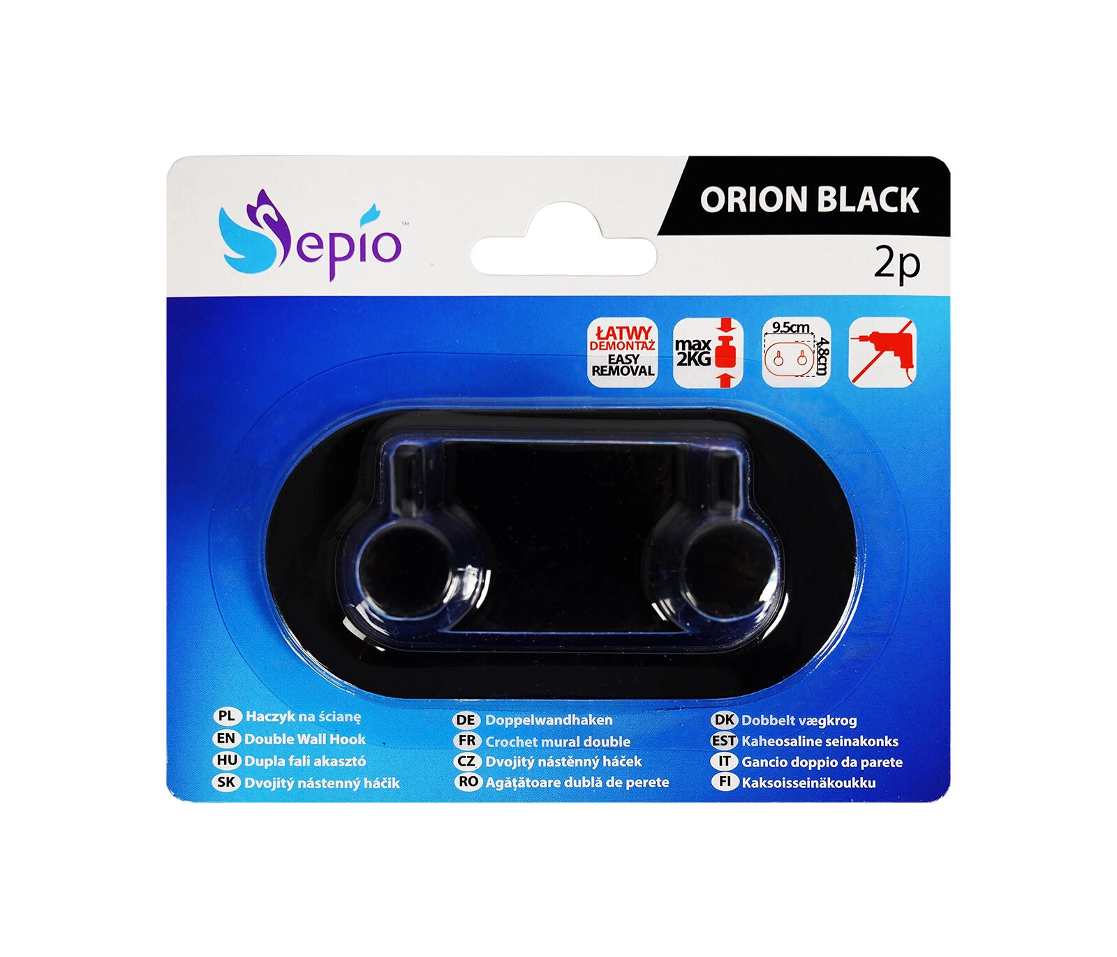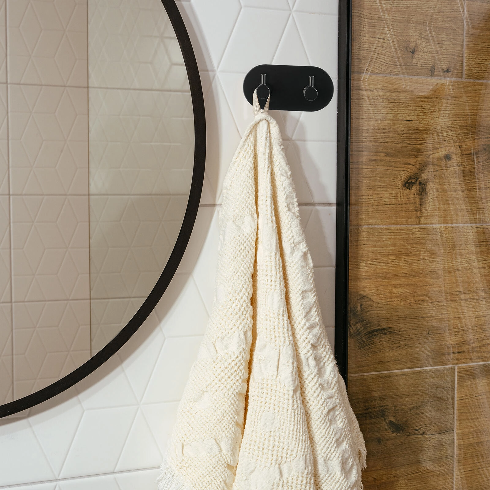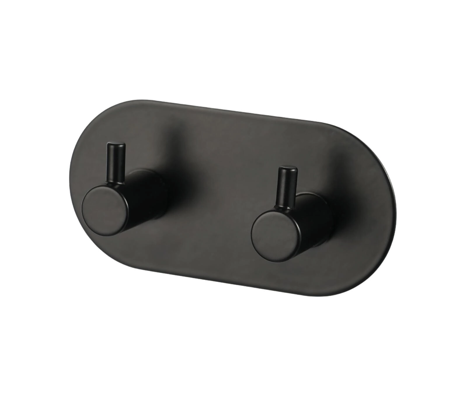 Praktična i elegantna samoljepljiva dvostruka vješalica od metala u mat crnoj boji za kupaonice, hodnike i kuhinje. Zahvaljujući jakoj samoljepljivoj podlozi lako je pričvrstite bez bušenja i oštećivanja pločica. Kompaktne dimenzije 9,5 × 8 × 4,5 cm i dvije robusne kuke osiguravaju red za ručnike, kućne ogrtače ili ključeve.