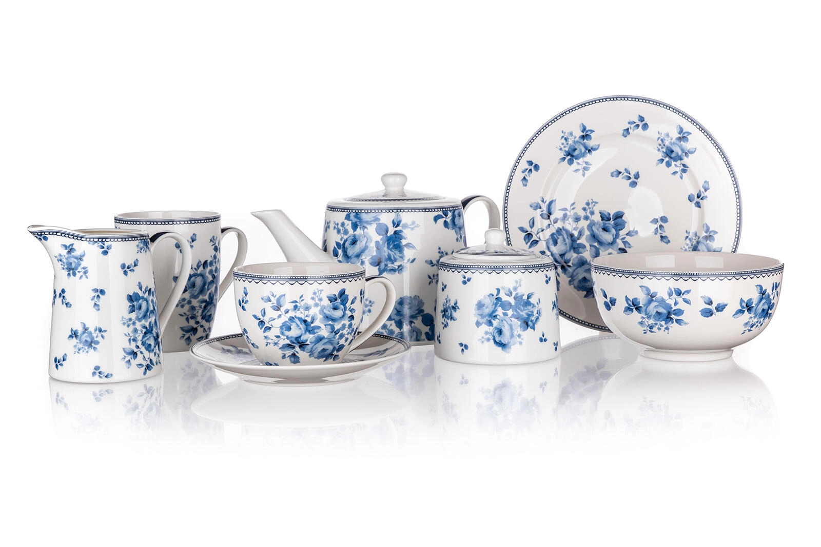 Kreirajte ujednačen set za posluživanje Blue Flower – čajnik, šalice, šećernica i drugi komadi u istom dekoru.