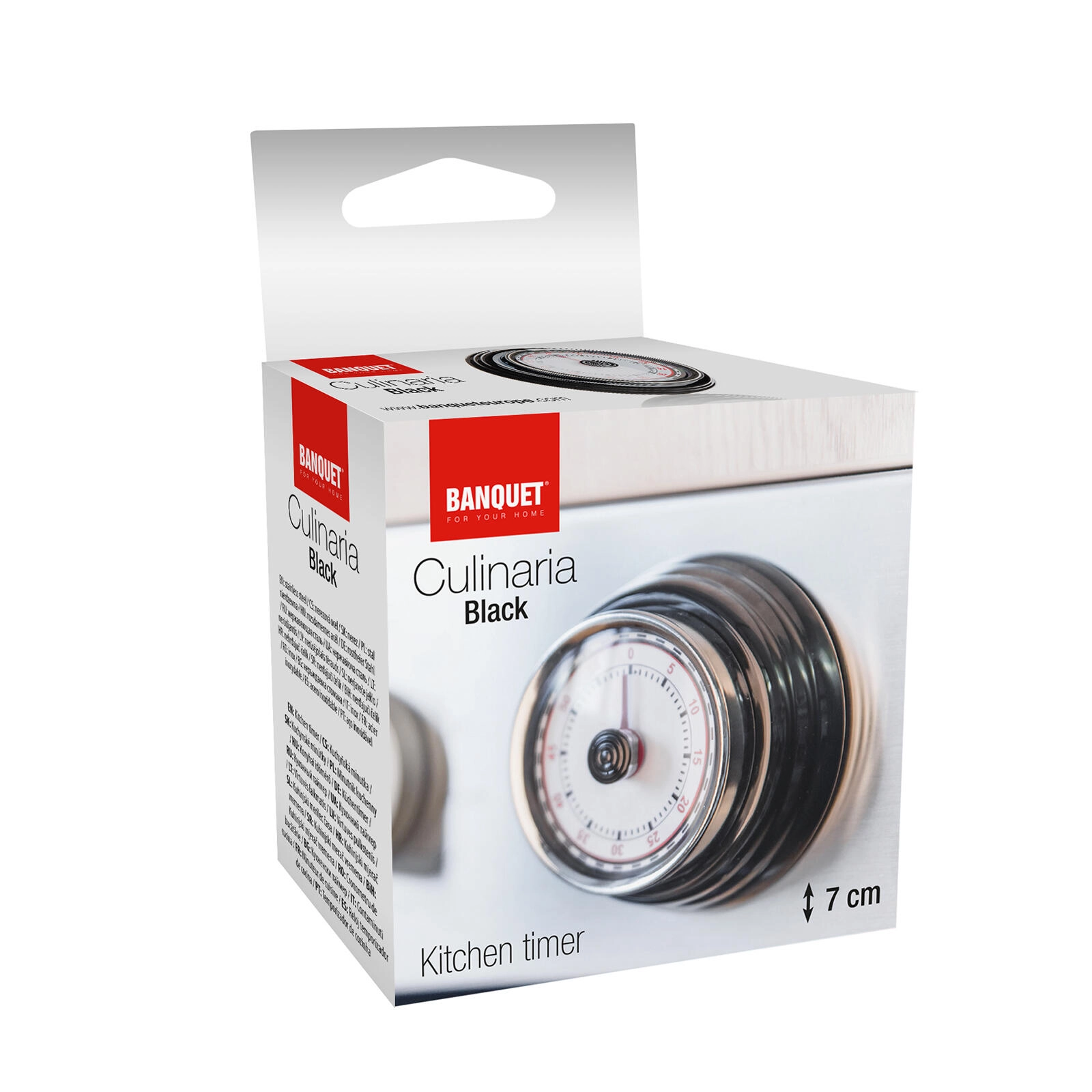 Otkrijte pouzdan mehanički timer CULINARIA koji se ističe elegantnom crnom bojom, kromiranim prstenom i čitljivim brojčanikom s izraženim minutnim oznakama. Postavljanje je brzo okretanjem središnjeg regulatora, a po isteku vremena oglašava se glasan zvučni signal.