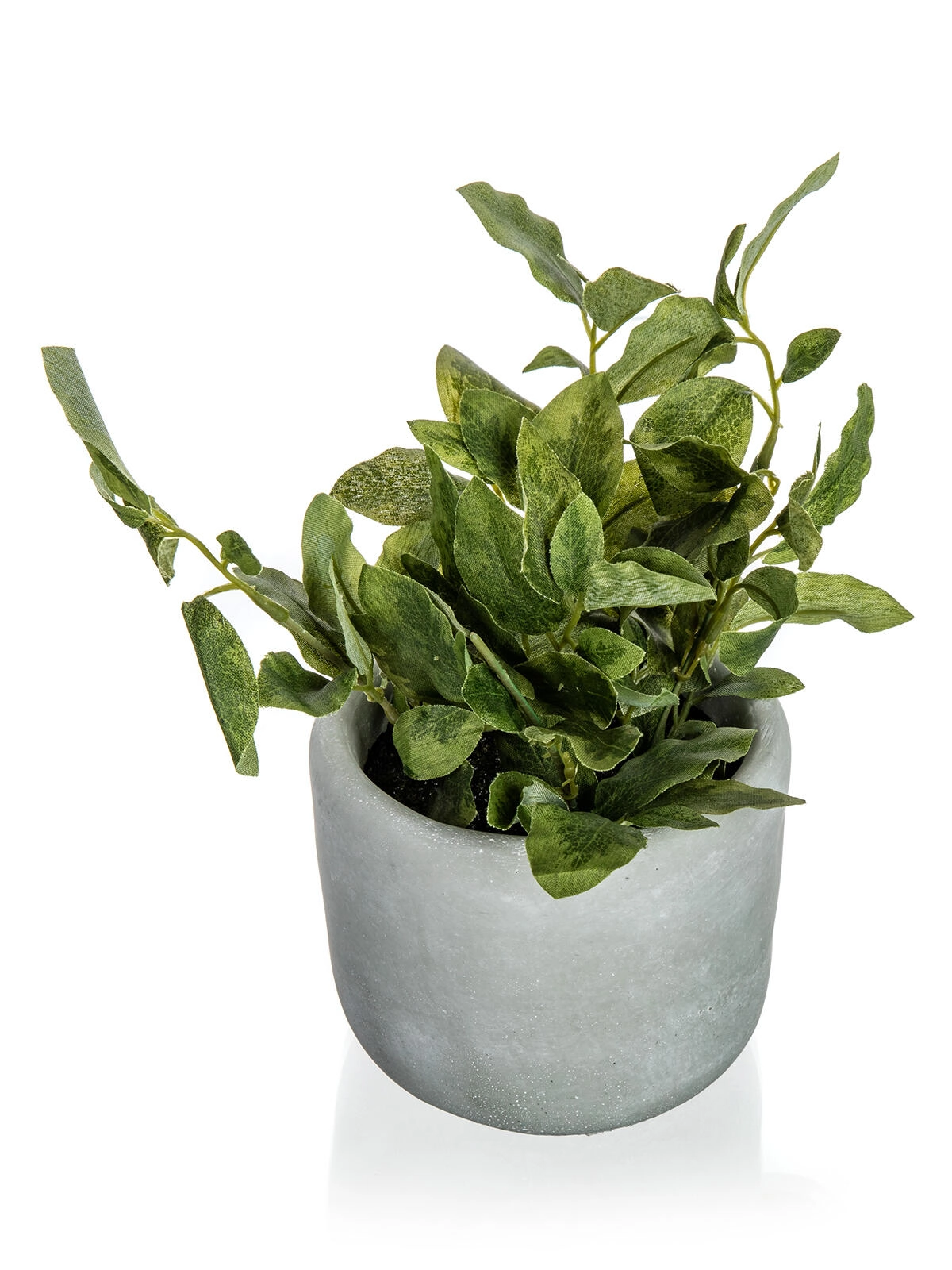 Ova dekorativna umjetna biljka u elegantnoj sivoj posudi donosi zelenilo bez brige u dom i ured. Realistično oblikovani i obojeni listovi stvaraju prirodan dojam, dok robusni betonski izgled posude daje moderan naglasak.