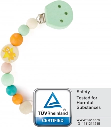 Čvrst metalni klips pouzdano se pričvrsti na većinu tkanina i sprječava pad ili gubitak dude. Površina je otporna na slinu, a korištena završna obrada bez toksičnih tvari, pa je proizvod siguran za bebe od 0+.